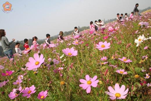 哇啊,好美喲!娃兒,好樂喔!第二富康農莊的大波斯菊(綠肥)花開正盛,金沙國小附幼的教師帶著小朋友到花田參訪,向「花花世界」學習。 小朋友們帶著水壼,由蔡素瓊、黃心盈兩名教師領前、殿後;他們行經榮湖與金沙水庫,來到田野,看到花海,一名小朋友忍不住說:「哇啊,好美喲!」另一個則說:「有好多顏色喲!」 大波斯菊是金門縣政府及農試所正在推廣的綠肥,顏色有淡紅、紫紅、白色等;小朋友們在教師的引導下,數著花瓣的瓣數。 師生們走入花叢後,還發現花田裡有很多的小蜜蜂和七星瓢蟲|有的瓢蟲把小朋友當花棲止。看到可愛的昆蟲,小朋友們更加興奮了。 這片花田,近來已陸續吸引若干人佇足觀賞或攝影。縣府和農試所推廣大波斯菊的目的,除了補助農民種植綠肥,還有推動觀光的用意;如今,還多了教育的用途。