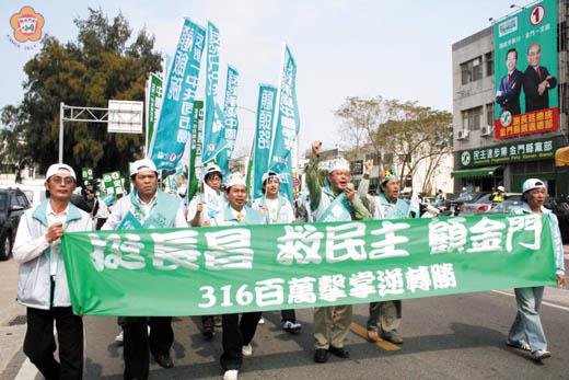 選前最後一個假日─超級星期日,藍綠選戰激烈,而這股效應也延燒到金門來!民進黨全台昨日舉辦「百萬擊掌逆轉勝」祈福活動,長昌金門縣競選總部隔海響應,近百人以水陸前進小三通水頭碼頭會師,表達「挺長昌、救民主、顧金門」,反對馬蕭提出「一中市場」,也向一水之隔的中國政權嗆聲。 長昌金門縣競選總部「百萬擊掌逆轉勝」大遊行昨日下午二時展開,由競選總部主任委員陳滄江擔任總指揮,競選總部副主任委員翁明志與近百名黨員、志工和支持者都到場參加,熱情聲援。 遊行隊伍從環島北路的競選總部出發,人人反戴帽、拉布條、舉旗牌,沿著民權路前進到縣立體育館,一路高喊「挺長昌、救民主、顧金門」、「謝長廷當選」等口號,唱響綠營士氣。 遊行隊伍經過民權路國民黨金門縣黨部時,藍營也正在集結支持者準備召開挺馬蕭大會,雙方人馬發生零星互嗆事件,所幸警方隔開人潮,未引發進一步衝突。 遊行隊伍在縣立體育館前換車,直趨小三通水頭碼頭,與搭載三十名青年軍入港的四艘客船會師,響應全台包括馬祖福沃港、淡水渡船頭、宜蘭南方澳、花蓮港、台東成功港、屏東東港、澎湖馬公港等七個港口同步辦理「百萬擊掌逆轉勝|萬船齊發挺長昌」活動,並於下午三時十四分準時相互擊掌逆轉勝。 陳滄江指出,選擇在下午三時十四分進行擊掌逆轉勝,除了全力支持長昌外,是因為中國在2005年三月十四日通過「反分裂國家法」,因此,隔海表達出對中國霸權的強烈抗議。 陳滄江強調,民進黨「三要三反」,即「顧飯碗,反對一中市場;要制衡,反對一黨獨大;要入聯,反對中國霸權」,尤其是反對馬蕭陣營的「一中共同市場」政見、及全面大三通直航的政見,因為如此的話,金門將首當其衝,失去中轉的功能,害死金門人。 長昌金門縣競選總部的擊掌逆轉勝活動,雖然僅不到百人參加,但因距離中國大陸最近,吸引包括法新社、Newsweek、遠東經濟評論、日本共同社在內十多位外國媒體記者採訪。
