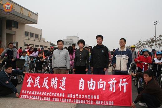 第十二任總統副總統競選活動昨日正式起跑,福建金門地方法院檢察署特別舉辦「全民反賄選、自由向前行」活動,儘管霪雨紛飛,但仍吸引三百多位民眾與親子熱情參加,金門地檢署提出「總統ㄟ頭家,選票嘸通賣」的呼籲,盼能乾淨選出國家新領導人。 單車反賄選宣導活動昨日上午九時在金門縣立游泳池前廣場展開,由金門地檢署檢察長張文政主持,偕同金門高分檢檢察長林玲玉、金門縣長李炷烽、縣府政風室主任謝健茂共同為宣導反賄選鳴槍。此外,觀護志工協進會理事長呂榮平也到場參與。 張文政指出,正副總統競選活動今天起跑,檢警調全力投入查察賄選行動,更希望總統頭家的全民來支持,共同遏止賄選歪風,在公平、乾淨下選出國家的新領導人。 此外,他也對先前的立委選舉,竟出現賄選情事,感到遺憾,他認為金門是一個有文化的好地方,期許金門能夠早日遠離賄選,創造乾淨選風。 林玲玉也說,此次活動有如此大的迴響,展現出全民反賄選的大團結,希望鄉親共同來支持反賄選。 李炷烽有感而發的指出,每次選後,坊間總會有賄選傳聞,讓鄉親感到很不舒服,回首金門的公職選舉歷程,是從民國八十年國大代表選舉開始,至今不過短短的十幾年,卻出現惡質的選舉文化,讓人相當痛恨,他強調,民主的意義應該是乾淨、公平的選出好的候選人,最後他也沈痛的呼籲,希望賄選早日在金門絕跡,讓金門的金字招牌可以真正響亮。 金門地檢署結合金門縣政府、犯罪被害人保護協會金門分會、金門縣觀護志工協進會、福建更生保護會等單位舉辦的反賄選單車宣導活動,宣布受理報名後,三百個名額在一周時間內就額滿,但仍有向隅的民眾到場參加,加入健身又反賄選行列。 金門縣警察局刑警隊長蕭欽杰昨日也率領十多位隊上的同仁與各警察所員警到場參與,壯大活動聲勢。 參加活動的民眾從游泳池前廣場出發,循伯玉路前進,經社會福利館、后沙、安岐、雙鯉湖溼地、慈湖,到終點站金門高中壘球場,雖然途中一度下起雨來,但民眾還是很有運動員精神的全程參與,大家一起有實際的行動,表達反賄選的決心。