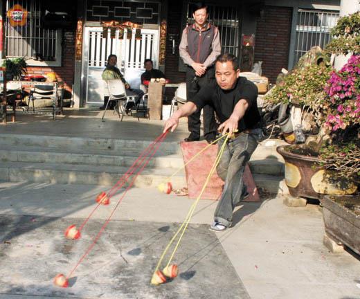 您見過一個人雙手一次可以成功擲出六個陀螺嗎?陀螺達人董怡能練就一手好技藝,功夫了得,把打陀螺當成特技在表演,演出數十種花樣,讓一旁觀賞的行人,拍手叫好,金城鎮公所希望接洽邀請到金門配合節慶演出,展現傳統民俗體育技藝之美。 民俗體育性雜技是中國固有歷史文化的重要資產,它結合體育的動作技巧以及剛勁健美的表現,這項雜技包含武術、陣頭,像是金獅陣、宋江陣等,以及各種需要高度技巧的民俗技藝,其中陀螺古稱為「甘樂」,在民間是唾手可得的童玩,如今隨著時代轉變已成為競技、表演的體育性雜技,它也堪稱為民間民俗文化不可或缺的一環,也是人們熟悉而溫暖的童年記憶。 家住金城鎮古崗村的陀螺達人董怡能在年輕赴台工作,為了打發時間消遣,就利用業餘時間去玩陀螺,一群業餘的陀螺愛好者玩出興趣就加入台北縣「三峽定點陀螺隊」成為該隊成員,把打陀螺當成特技在街頭表演,讓來到三峽老街的遊客都可以看到精采絕倫的演出。 董怡能表示,陀螺又名「獨樂」,閩南話叫「甘樂」,是一種古老的遊戲;在江南,人們又稱它「地靈」,起源可上溯至宋朝,出現一種用手擰著旋轉類似陀螺的玩具─千千,是宮中的一種遊戲,後來流行到民間各地,至今已有四、五百年的歷史。每次台灣有辦民俗體育薪傳活動時,主辦單位特別廣邀全台推動民俗技藝有成的「三峽定點陀螺隊」,到場表演定點陀螺、障礙陀螺及陀螺走鋼索,神乎其技的陀螺演出,甚至可以將陀螺打在手上,將陀螺藝術發揮得淋漓盡致。 董怡能強調,「三峽定點陀螺隊」雖然是一支由業餘人士組成的團隊,但表演上堪稱專業級,表演者一個人雙手一次可成功擲出六個陀螺,還可讓陀螺在釣魚線上走動。能表演出陀螺花開並蒂、三陽開泰、四季花開、超越障礙、過山泡、上瓶底、擲上手心、上高帽、單車擲準、放鞭炮…等超高難度技藝,展現各種花式技巧的傳統民俗體育技藝之美。每一種動作,如以人手、頭部接陀螺,或30顆陀螺共轉的大陣仗,總教一旁觀賞的行人,拍手叫好。 董怡能也說明如何把陀螺準確打在距離地面高度130公分的鐵盤上,不失誤又可以旋轉的很平穩,這就是定點陀螺的難度所在。只見董怡能纏好繩子,熟練的動作一甩,簡直就像極了特技表演,這些打陀螺經驗都是憑著一股熱情,犧牲每週的休假時間,在三峽老街義務的演出跟教學。