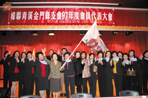第十二任總統副總統競選活動於廿三日正式起跑,在婦聯青溪金門縣支會主任委員楊配治號召下,婦女聯合會青溪分會金門縣支會各鄉鎮支分會昨日齊聚金城鎮公所舉辦九十七年會員大會暨馬蕭後援會成立活動,該會會員暨眷屬一百多人齊聚會場,由婦聯青溪分會特派督導、馬蕭競選總部顧問團團長林豐正夫人黃雪代表馬蕭授旗給地區後援會會長楊配治,黃雪希望婦聯青溪的姐妹們大家動員起來,同心協力,心手相連,支持馬蕭,擁護泛藍,在三月廿二日投下神聖一票,將馬蕭送進總統府,現場在高喊「馬蕭加油、馬蕭當選」呼聲下圓滿落幕。 這項由婦聯青溪分會金門縣支會暨各鄉鎮支分會聯合辦理的九十七年度會員大會暨馬蕭後援會成立活動,在婦聯青溪分會金門縣支會主任委員楊配治號召下,於昨日上午十時在金城鎮公所七樓展演廳舉行,參與人員包括婦聯青溪分會特派督導、婦聯青溪金門縣支會主任委員顧問團團長林豐正夫人黃雪、婦聯青溪分會常務委員劉明姿、幹事邢雅筑、婦聯青溪台北市支會主任委員、台北市議員林奕華、馬蕭金門競選總部主任委員李炷烽縣長、馬蕭金門競選總部副總幹事吳成典、國民黨金門縣黨部主委江士良、金門縣議會副議長許玉昭及婦聯青溪金門縣支會金城、金湖、金沙、金寧、烈嶼支分會委員與眷屬一百多人齊聚一堂,婦聯青溪金門縣支會頒銅質榮譽徽獎項表揚九十七年青溪夫人楷模,得獎者有李能招、周昭治、梁明月、陳玉梅、陳彩雲、鄭秀貞、林宜蘭等七人,也安排有世新大學口傳系講師鄧盛宇專題講座,同時舉行馬蕭後援會成立授旗典禮,並有帶動唱「我們都是一家人」帶動熱鬧氣氛。 黃雪在抵達現場時受到婦聯青溪的姐妹們熱烈歡迎,黃雪也代表馬蕭競選總部授旗給婦聯青溪金門縣支會主委、後援會會長楊配治,在場觀禮有婦聯青溪分會常務委員劉明姿、幹事邢雅筑、婦聯青溪台北市支會主任委員、台北市議員林奕華、馬蕭金門競選總部主任委員李炷烽縣長、馬蕭金門競選總部副總幹事吳成典、國民黨金門縣黨部主委江士良、金門縣議會副議長許玉昭及婦聯青溪金門縣支會金城、金湖、金沙、金寧、烈嶼支分會委員與會員,並一齊高喊「馬蕭當選」。 婦聯青溪分會特派督導黃雪於授旗後向婦聯青溪的姐妹們保證,馬、蕭是清廉、正直又有經濟專業的人才,支持馬蕭絕不會錯,並呼籲姐妹們為馬蕭成立個人後援會,希望婦聯青溪的姐妹們大家動員起來,同心協力,心手相連,在三月廿二日投下神聖一票,將馬蕭送進總統府,讓國民黨重新執政,用選票唾棄貪腐、無能的民進黨政府。 馬蕭金門競選總部主任委員李炷烽縣長表示,我們不一定要干預政治,但奉勸所有青溪姐妹們定要關心政治,因我們的日常生活都會受到影響,所以這次選舉,大家不要掉以輕心,在金門雖是泛藍的大本營,但如何把力量發揮到親朋好友,甚至海外華僑台灣親友,今天多做一份努力,就是多一份把握。李縣長強調只有判斷、也一定要有行動,才能產生力量,希望大家凝聚共識,團結力量,支持馬蕭,擁護泛藍,在三月廿二日投下神聖一票,將馬蕭送進總統府。 國民黨金門縣黨部主委江士良也指出,民進黨政府執政七年來,台灣經濟很快變壞,失業人數、自殺人數卻創歷史新高,國家一團亂,民生凋敝、百業蕭條,弊案重重,百姓的生活痛苦指數卻向上提升,希望婦聯青溪的姐妹們以行動支持馬蕭,並拜託向在金門和台灣的親朋好友們拉票,支持「馬蕭」當選總統,讓國家重新出發,民眾生活痛苦指數才能降低,找回失落的幸福,金門也會更有發展。