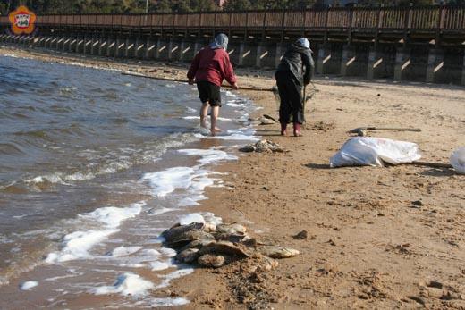 大太湖昨(十九)日出現上百尾的死魚,大多是吳郭魚,捕撈人員用網和耙子,站在湖水中撈起死魚;如果天氣還不能趕快回暖,抵不住低溫的魚,還是會繼續被凍僵或是凍死。 自農曆年前,寒流一波一波來襲,天氣一直是冷颼颼的,水溫也很低。據太湖打撈死魚的人員表示,從農曆年除夕,寒流來襲,湖中的吳郭魚抵不住水溫太低,有的被凍死,有的被凍得剩一口氣,在水面上隨波逐流。 昨日下午,大太湖下游水面又出現上百尾已被凍死的吳郭魚,有的被打撈人員用網或是耙子撈,已經是奄奄一息了。 據打撈人員表示,一天最少也有四、五十隻湖裡的吳郭魚被凍死;最多的話,一天也有一、二百隻被凍死。由於今年,幾乎每天都有打撈人員在湖邊進行死魚打撈工作;因此,大太湖才未見到像往年一樣大批死魚的景象,也維護了水質。 前幾天,還有民眾用網到太湖捕撈吳郭魚,可能是因為被凍僵的或是被凍死的吳郭魚太多了,已不見有人前往捕撈的情形。 不過,如果天氣不能趕快回暖,繼續低溫的話。打撈人員表示,抵不住水溫太低的魚,還是會繼續被凍死。所以,只有期望天氣趕快回暖,讓水溫升高,魚才能越過寒冷的天氣生存下去。