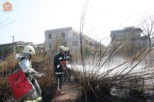 金城鎮西門里(宏德宮)珠浦西路八十二巷口一帶昨日傳出「火燒埔」,火勢在風力助長下,迅速蔓延,甚至一度延燒到住宅附近,險些波及鳳翔社區住家,情勢顯得很危急,所幸消防分隊全力支援搶救得宜,幸未釀成大災禍。火勢並於上午十一時十分撲滅,至於真正起火原因正由縣消防局火調課小組人員調查中。 金城消防分隊昨天上午十時二十分許接獲民眾報案,指稱西門里(宏德宮)珠浦西路八十二巷口附近發生一起火燒埔,濃煙密佈,可能會延燒到鳳翔社區住宅,相當危險。 金城消防分隊獲報後隨即由分隊長李宗仁率領消防隊員替代役等人及兩部消防車火速馳抵火場展開灌救,金寧消防分隊分隊長董必文也帶領打火兄弟及兩部消防車火速前往支援,而鳳翔社區珠浦西路八十二巷住家附近也險遭火災波及,火勢離住家只有數公尺,延燒到圍牆附近雜草,頓時烏煙瘴氣瀰漫,附近住家居民也趕快搶救滅火,在金城、金寧消防分隊打火弟兄冒著濃煙奮不顧身深入火場灌救,由於風勢不小,火勢一度往住家附近蔓延,在緊要關鍵之際,打火弟兄採兩面包抄的救火方式,全力進行滅火,消防隊員花了一番功夫,迅速將火勢控制,同時,另一組兵馬則以火拍撲滅火星,火勢立即被撲滅控制,可以說是不幸中大幸,化險為夷,沒有任何財物損失。 這起火燒埔火警,金城、金寧消防隊昨總計出動四輛消防車,動員近二十名消防人力,於昨日上午十一時十分順利撲滅,現場燒得焦黑一片,至於詳細起火原因,消防局正在做進一步調查。消防分隊同時指出,星星之火,足以燎原,在山林田野間切勿亂丟煙蒂或散播任何火種,以防引起山火;違反山林、田野引火燃燒規定者,依消防法第四十一條規定,可處新台幣一千元以上六千元以下罰鍰。並再次呼籲民眾務必要小心火燭,千萬不要任意焚燒雜草或垃圾,燃燒時也應注意火苗,離開前要確定火已撲滅才能離去,以免釀成火燒林、火燒埔等任何火警事件。