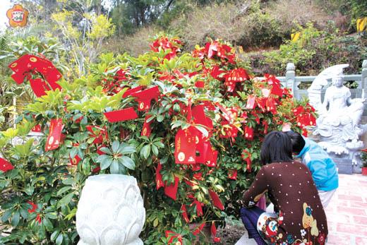 金鼠年已來到! 於春節假期間,人們除了到各地風景區走春,或是去參觀農業新春展,也會到寺廟安太歲、點光明燈,祈求吉祥、平安、如意。 迎接新春,太武山海印寺備有新春敲平安鐘、摸安心石等祈福活動外;更貼心的備有「許願樹」,讓到佛寺的香客,自己在許願卡寫下新一年的心願,自己掛上「許願樹」。 每一株「許願樹」都掛滿了香客的各種心願和新年新希望;願他們都能在鼠年裡心想事成、美夢成真!