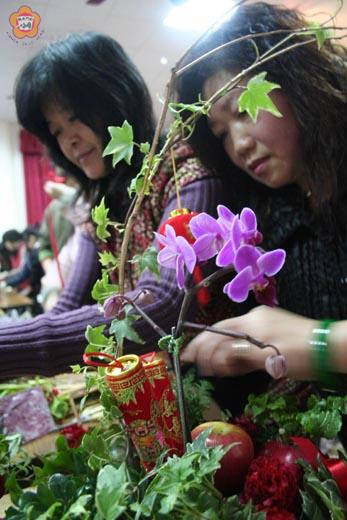 迎春納福! 「蝴蝶蘭」招福迭來,「長春藤」共春長在;紅蘋果配紅蘿蔔,迎春納福生光彩! 沙美長老教會的婦女團契前夜舉辦了「迎春納福」插花研習。使用的花材包括:蝴蝶蘭、長春藤、紅蘋果、「燈籠紅」紅蘿蔔,另有炮竹狀的「春」、「福」等紅底金紋的閃亮飾品。 藉由插花藝術,婦女團契希望以花、草之美,佈置出活潑、可愛、溫馨的家。這項活動,也有團契以外的男女參加。