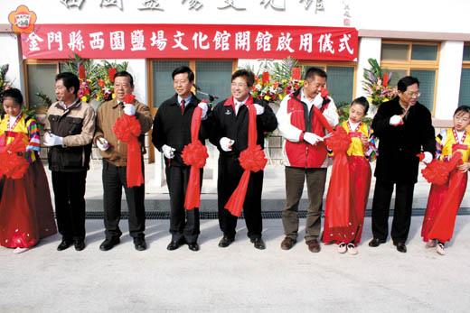 金門縣西園鹽場文化館,昨(二十三)日在祥獅獻瑞及才藝表演揭開了開館啟用序幕,縣長李炷烽及與會貴賓聯袂剪綵;李縣長希望大家珍惜與愛護金門珍貴的文化資產;同時,於金鼠年的來到,民主開放的腳步,能為金門帶來春天的喜訊。 西園鹽場文化館開館啟用典禮,於昨日上午十時舉行;由李縣長親自主持,並與金沙鎮長陳昆第、縣議員楊應雄、蔡水游及西園鄉老莊太白和貴賓共同剪綵;而金沙學區中小學各校的祥獅獻瑞、鑼鼓陣、阿里郎、草原晨曲、跳鼓陣的才藝表演,也為西園鹽場文化館開館啟用,增添了熱鬧的喜氣氣氛,西園鄉親更視為是村子的一大喜事。 李縣長於致詞時,首先向在場的與會賓貴和鄉親拜早年,祝大家新年快樂。 李縣長表示,金門西園鹽場有著悠久的歷史,根據縣史記載,西園鹽場草創於唐代末年、五代期間;有史可考的,西園鹽場是元朝大德年間建場,至今約有七百多年的歷史,是金門產業的重心,更是金沙的生活的重心。 李縣長指出,由於時移事異,西園鹽場於八十四年間關場,從此走入歷史。而鹽,是過去的戰備物質,也是生活的必需品。但是到了今天,講究保養的時代,鹽變成了是可有可無的了。 李縣長也不諱言的說,西園鹽場過去十二年來,這樣好的文化資產,一直閒置著、甚至荒廢,是文化立縣的一大敗筆,也是很諷刺的一件事。 李縣長表示,很慶幸,地區有文史工作者,特別是文化局有感於文化資產的珍貴與價值,經過六年的規劃、籌備,以及熱心的文化工作者積極的參與,西園鹽場文化館,才能以新的面貌呈現在大家的眼前。李縣長並感謝所有參與者所提供的意見和指導。 李縣長指出,西園鹽場文化館雖然是簡陋,但是也是很古樸,希望大家珍惜和愛護,共同維護金門珍貴的文化產。 話鋒一轉,李縣長談到了花崗石的問題,他說,看到金門到處充滿花崗石,有著很多的感觸;以前任何村莊要看到花崗石板是不很容易的。記得以前湖下,要新厝才有石埕,不是新厝就沒有石埕。所以,一塊磚、一塊石,對金門來講都是很難得的、珍貴的;今日多了,似乎顯得就不值錢,甚至氣候的暖化、氣溫的升高,都歸咎於他本人賣石塊,才造成大地的暖化。李縣長說,這不曉得是二十一世紀的、還是二十二世紀的言論。他相信於縣長任內,除了原有的場地,既有的需求,任何的一個美化,石板比水泥板來得不熱。而採用花崗石板,是民意所趨,也是環境所形成的。 李縣長表示,兩岸不能直接來往,金門花崗石不能開採,要找到花崗石美輪美奐的廣場,是不可能的。李縣長希望大家在看待一件事物,能持平的看待。 對於社會的風氣,李縣長也強調,選舉害死大家,害得人與人之間沒有是非,彼此間沒有信任狀況。他說,中國古人講「路遙知馬力,日久見人心」,是千古不異的道理,多少的前人經驗的累積,告訴我們的一個哲理。相信很多的人,是禁得起考驗的,但還是有些人禁不起考驗,只有時間能證明一切。 李縣長進一步的談到金門的未來發展,他說,台灣經濟的衰退,不是財經政策造成的,而是兩岸的關係沒有辦法開展開來;金門作為兩岸關係的前緣,假如沒有一個開放的政策,任何一個神仙,即使八仙過海,是無法改變金門,金門還是金門,不能成長、更不能進步。 李縣長希望民主的腳步,帶來金門的春天喜訊;民主的過程,讓一個迷失的良心,喚醒和找回真正的良心。 最後,李縣長也提到,他就讀湖埔國小時,曾兩度到西園鹽場參訪,對於西園的山明水秀,讓人羡慕。他說,文化資產是大家的,政府是輔者,對西園鹽場的重新補救,表示一個文化的價值,也顯示一個可貴的精神;希望鄉親愛惜它、關心它,做得好的不需給他本人鼓勵,多給工作人員支持,壞的給予指教。同時,歡迎大家常到西園鹽場文化館走走,讓過去的人潮和盛況能再度回來。 金沙鎮長陳昆第表示,李縣長就任以後,對東半島的發展十分重視;對於西園鹽場文化館的啟用,他以感激的口吻表達謝意,希望未來更有發展,達到「舊村落新風貌」的目標,帶動金沙的繁榮。 縣議員楊應雄表示,鹽場是過去的重要產業,而西園鹽場文化館開館啟用,是西園的喜事,也是金沙鎮的一大喜事;希望還有二、三期的擴建,並連接金沙的觀光景點、觀光公車,讓經濟轉成觀光、文化的價值,成為未來發展的希望所寄。 縣議員蔡水游表示,西園監場文化館開館啟用,能增進觀光和文化產業;希望增加經費充實鹽場文化園區,達到教學和經濟的效益。他也預祝大家事事如意,新春愉快。 西園鹽場文化館開館啟用典禮之後,李縣長也走入會場,一一的與在場鄉親握手致意,並聽取對鹽場文化館的期望和建言。隨之,李縣長也參觀了各典藏展示館,整個典禮至上午十一時,歷經一小時許,才圓滿告一段落。