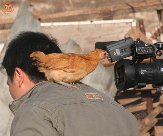 雞對機! 金湖鎮前鎮長陳永財的雞寮失火,新聞記者在火場蹲著拍攝畫面時,一隻雞居然「騎」到一個記者的肩上,與另一個記者的攝影機對看。
