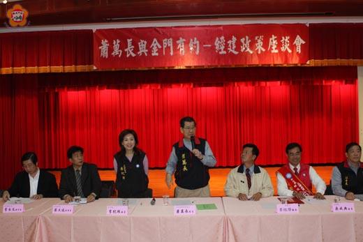國民黨副總統參選人蕭萬長在經建座談會中,與縣長李炷烽及各行業代表面對面溝通,聽取金門地方的需求和意見,他強調,開放的政策是振興金門經濟最有效藥方,馬英九和蕭萬長如獲得支持,有機會為人民服務,一定會制定特別照顧金馬外島的政策。 在經建座談會中,包括縣政府和金門農、漁、工、商會理事長也提出多項建言,盼望未來政權輪替,馬英九、蕭萬長順利當選總統、副總統後,重視金門基層的聲音和地方的需求,來協助改善問題。 縣府建設局長李增財提出的建議事項,包括有,政策制定台灣本島與各離島應分開思考;以金門的特殊地理區位(大陸與台灣)與獨特的綠化、生態環境及良好的人居基礎設施,應可朝幾個方向發展,包括,兩岸和平試驗島、成為國內首座國際養生島、兩岸學術合作的大學島、國內首座有機生態島,期望能得到中央的青睞,讓金門的生機無限。 縣政府研考室主任陳朝金也就金門成立「特別行政區」可行性之探討報告,提出請中央成立金門特別行政區促進委員會,參考日、韓國家對於離島發展管理制度設計、法規修訂,例如,韓國之濟州特別自治道,日本之離島振興法,律定計畫期程,落實推動,期望朝制定專屬法規或於地方制度法增列離島專章;本縣縣民屢次建議之意見,建議能納入特別法制或增修離島建設條例;發展「境內關外」的邊境貿易機制。 農會理事長蔡水游反映中央政府未能真正照顧到金門地區的農漁業,金門鄉親對於馬蕭有很多的期待,期盼馬蕭順利當選正副總統,未來真正落實照顧到金門農漁業政策。 商會理事長蔡天送提出將中華民國持有合法護照者,均可循小三通自金門自由進出大陸地區探親、經商、旅遊等,增益金門觀光,提振商機。兩岸貨物均得循小三通由金門中轉,取代港澳中轉功能,這是操之在我,只要政策同意馬上即可執行。開放陸資投資,以帶動經濟景氣;引進陸勞,以提振工業加工,雙方建立小額貿易秩序,雙方認證之檢驗標準及設施,逐步推動實施,將可實質有效帶動地區商業景氣;擴建金門機場及港口;金門的定位應改為行政特區直屬中央,並能實質照顧離島居民的前提下,應規劃為免稅特區,加速金門的發展。競選團隊若執政,大三通的規模、方向?小三通的方向、未來何去何從? 漁會理事長陳水義提出建議在新湖漁港設立兩岸漁產品交易中心,並在總量管制下,開放大陸漁貨中轉台灣,帶動金門漁業景氣。金門環境適合養殖業的發展,建議比照台灣和馬祖開放大陸漁工到金門工作,可減輕業者的人力負荷和成本。發展休閒漁業,在金門南海岸設立休閒漁業園區,帶動觀光產業。 總工會理事長李永文也提出,經濟不景氣,勞工衝擊最大,蕭副總統是經濟家,希望未來馬蕭當選國家正副領導人,開放陸客來金觀光,台灣人民自由中轉兩岸,來實質帶動金門的發展。