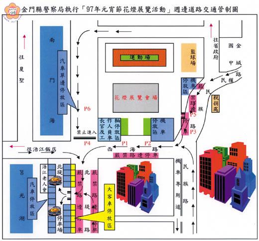 配合縣府於今元宵節舉辦花車遊行、提燈踩街暨花燈展覽活動,縣警局為維護活動期間及展覽地點周邊道路行車順暢,及前往觀賞者行的安全,將於活動期間規劃警力實施交通疏導管制措施,並請前往參加活動民眾能依照交通警察人員的指揮,以維護行車順暢。 縣警局指出,為因應縣府首次舉辦之花車遊行及元宵節提燈遊行活動,警察局將於今日活動期間全程派員執行交通疏導管制工作,交通疏導管制時間為下午三時至五時止,由交通隊派遣前導車一部,全程引導元宵節花車遊行。遊行路線將由縣立體育館出發沿金湖鎮(繞新市)、金沙鎮(繞沙美街道)、金寧鄉(繞頂堡街道)再返回金城地區。 至於元宵節提燈遊行活動交通疏導管制時間為下午六時至九時止,遊行路線由縣立體育館|民族路|天后宮|民權路|外武廟|城隍廟|內武廟|民權路|民生路|金門縣政府|中興路|北鎮廟|莒光路|靈濟古寺|模範街|金城鎮公所|東門圓環|代天府|五嶽廟再返回體育館,遊行活動行經路線由各轄區警察所及保安隊派員執行交通疏導管制工作。 另外,為因應前往觀賞花燈展覽人潮所駕駛之車輛停車問題,將自今日下午四時至十時,及明(二十二)日、二十三日每天晚間六時至十時於體育館週邊道路實施交通疏導管制措施。 縣警局交通隊表示,由於體育館週邊停車空間確實有限,縣警局也呼籲前往觀賞花燈展出之民眾,儘量能多人共乘一輛車,並將車輛停放於北堤路外停車場後,步行前往體育館欣賞,或是搭乘公車前往,若自行駕車前往之車輛,也請務必配合現場交通警察人員等指揮與管制,以維護體育館週邊道路行車順暢,及人員安全。