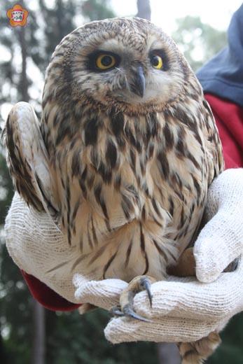 去了一隻,又來一隻,金門國家公園上周曾在峰上天后宮野放一隻短耳鴞,昨又收容了另一隻短耳鴞。這隻短耳鴞是前夜由兩名高職學生送交金沙警察所,再由金沙警察所交給金管處動物救傷站的。 短耳鴞,圓「面盤」,有張娃娃臉;瞳孔黑,「鞏膜」黃,眼神光豔豔;夜也行,日也行,鼠輩急閃閃!短耳鴞是老鼠的剋星,是保育類的猛禽。牠的體色主要是灰、棕色的,雖沒有亮麗的羽毛,但黃色的眼鞏膜(眼白)和深色的瞳孔卻光彩動人,讓送走他的兩個學生覺得很捨不得。 這隻短耳鴞是先被他人抓到,然後再被送給金門農工的學生張士文和柳逸昕;他們雖然很喜歡這隻野生動物,但既怕養不活,又怕觸法,因此便交給金沙警察所處理。 張士文是漁業科的學生,小時候養過鸚鵡,遠洋實習時,曾在甲板上見到成群海鷗;不過,從小到大,沒有什麼鳥曾像這隻短耳鴞一樣,讓他覺得鳥類竟是這麼的可愛。 柳逸昕是養殖科的學生,小時養過鴿子;同樣的,他也被短耳鴞的魅力所吸引。 他們意外得到短耳鴞時,只知道牠是貓頭鷹,不知道牠是短耳鴞,本想留下來當寵物,但又怕養不活。為了短耳鴞的健康,也為了不違背保育的正確觀念,終於決定把牠送到警察所,再由警察轉交國家公園。不過,這兩名學生希望有機會能到金管處去看看保育人員怎麼照顧「落難」的短耳鴞。 金門國家公園管理處的保育人員昨天早上將短耳鴞接回去後,對照圖鑑,確認牠就是短耳鴞。做了必要的紀錄之後,保育人員還出門去買雞肉,準備讓牠保餐一頓。 短耳鴞又名「倉鴞」、「小耳木兔」或「短耳貓」,是少數會在白天活動的貓頭鷹。牠的體形與長耳鴞很相似,差別在耳朵很不明顯。牠有顯著的面盤和動人的眼睛。體色主要為黃白色或黃褐色,分佈許多黑色或深色的斑紋。 今年十二月四日,也曾有一隻短耳鴞被民眾在峰上的芭樂園中拾獲。當時,短耳鴞掛在鳥網上,鼻子有出血的情形,但只是受到輕微的外傷。收容期間,峰上的短耳鴞食慾良好,每天約進食四到五次,每次吃三十到四十公克的生雞肉。恢復健康後,上周四,金管處已經把牠送到峰上天后宮前的曠野野放。 短耳鴞到金管處做客已經不只一次,在動物救傷站,牠們將會有很好待遇,但只要元氣恢復,都會被野放,以免對人類產生依賴,喪失野性。被高職學生間接送來的這隻短耳鴞,在適當時機,也將會被安排野放。