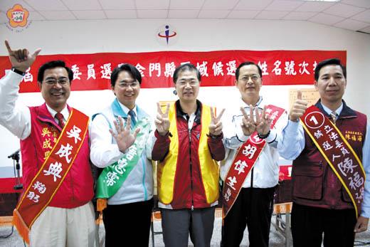 金門縣第七屆立法委員選舉「六搶一」,候選人號次抽籤作業昨天舉行,抽籤過程十分順利,抽籤結果:一號陳福海、二號李沃士、三號高絃騰(公民黨)、四號胡偉生、五號唐惠霈(民主進步黨)、六號吳成典(中國國民黨)。 金門縣立委候選人號次抽籤作業,係於昨天上午十時在金門縣政府大禮堂舉行,由金門縣選舉委員會委員盧志權主持,六位參選人中,僅高絃騰未出席,由選委會代為抽籤,其他五位參選人均親自出馬。 金門縣這次立委選舉六人參選,應選名額為一席,盧志權希望候選人都能在公平公正下,心平氣和做君子之爭,不要有買票賣票行為,他也鼓勵大家踴躍檢舉賄選,不要讓賄選產生。 抽籤前,金門縣選委會監察小組召集人盧錫銘報告選舉監察暨公職人員選舉罷免法有關法令,包括:競選活動的規範;競選言論的限制;金錢暴力介入的防堵等,提醒參選人公平競爭,以免觸法受罰。金門縣選委會總幹事洪國正也說明抽籤方式,係按照候選人申請登記之日期及時間之先後順序進行,即先登記先抽籤為原則。 抽籤過程中,競選連任的中國國民黨提名候選人吳成典最先上台,抽中六號,他立即說出「六六大順」,台下支持者也發出「當選、當選」的呼聲。 民進黨提名候選人唐惠霈抽中五號,高呼「五福臨門」,台下民進黨支持者也同樣發出當選的歡呼聲。 縣議員李沃士則抽中二號,並比出「V」的手勢,高呼「勝利在望」,陪同的李氏宗親與支持者,也連連發出「當選」聲。 陳福海抽中一號籤王,比出大拇指,陪同的陳宗新則上台亮出「一定當選」捲軸,也獲得支持者「一定當選」的喝采聲。 胡偉生最後上台,抽出四號,支持者立即喊出「勢必會贏」。 陳福海、李沃士、胡偉生、唐惠霈、吳成典五人稍後並應媒體要求,比出各自抽出的號碼數字,合照留念。 金門縣選舉委員會表示,立委候選人號次抽籤作業完成後,後續還將要辦理的第七屆立法委員選舉選務工作程序計有:十二月二十一日前,函報區域立法委員候選人抽籤號次;十二月二十三日前,編造選舉人名冊;十二月二十五日至十二月二十七日,辦理選舉人名冊公告閱覽;十二月二十八日至二十九日,查核選舉人名冊更正情形;十二月三十一日前,編印完成選舉公報;九十七年一月一日,公告候選人名單與競選活動期間之起、止日期,及每日競選活動之起、止時間;九十七年一月二日至一月十一日,辦理公辦政見發表會,辦理政黨使用電視從事競選宣傳;九十七年一月八日,公告選舉人人數;九十七年一月九日前,完成選舉票印製,分送選舉公報及投票通知單;九十七年一月十日,將選舉票發交鄉、鎮公所;九十七年一月十一日前,計票中心完成佈置;九十七年一月十一日,選舉票發交投票所主任管理員及佈置投票所;九十七年一月十二日,投票開票,統計開票結果;九十七年一月十四日,進行得票數相同之候選人或剩餘數相同之政黨抽籤;九十七年一月十六日前,函報選舉結果清冊及當選人名單;九十七年一月十八日前,審定當選人名單;九十七年一月十八日,公告當選人名單;九十七年一月二十四日前,致送當選證書;九十七年一月二十七日前,寄送區域、原住民各候選人在每一投票所得票數表;九十七年二月十七日前,發還候選人保證金,通知候選人領取補貼之競選費用,召開選務檢討會;九十七年七月十八日以後,發還候選人財產申報資料。