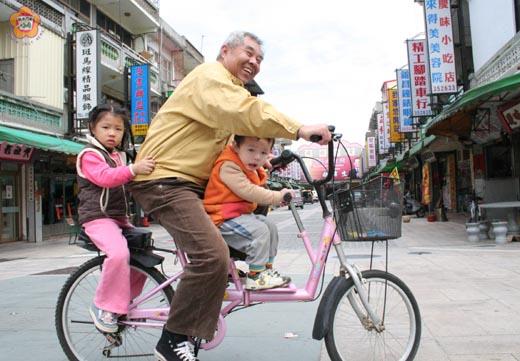喘吁吁,樂呵呵!祖孫情,隨單車。 沙美一位阿公,用單車載著孫女、孫子逛大街。祖孫三人剛剛騎經一處小斜坡;阿公腳下踩得有些吃力,嘴上卻揚著笑意。他說:「哈哈喘」!