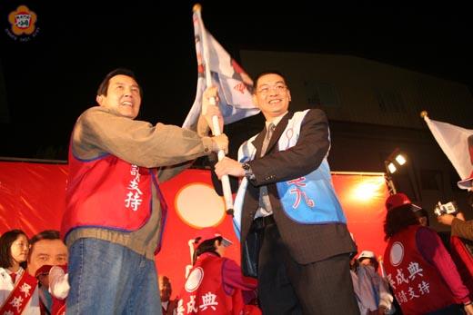 第十二任總統副總統候選人馬英九、蕭萬長暨第七屆立法委員候選人吳成典競選總部紅心團結大會昨晚舉行,總統候選人馬英九跨海向金門鄉親懇託,為吳成典站台助選,強調要以「兩腳馬、不怕累」精神來為鄉親拚台灣經濟,並表示選出的總統是代表團結的象徵,不是分裂的來源,以終結民進黨執政向下沈淪的虛耗,改變戰地命運,開創金門發展生機! 這項競選總部聯合團結大會昨日晚間七時在中國國民黨金門縣黨部前廣場舉行,包括擔任馬蕭金門競選總部主委的縣長李炷烽、前福建省省主席顏忠誠、後援會會長議長謝宜璋、國民黨金門縣黨部副主委許玉昭副議長、顧問團團長親民黨金門縣黨部主委楊耀芸、縣議員洪成發、洪允典、林長耕、楊應雄與議會主管及總幹事江士良及旅台金門同鄉、金酒產業工會、縣婦女會及各鄉鎮後援會輔選幹部、馬蕭支持者二千多人擠滿黨部前廣場,在北門社區醒獅隊表演祥獅獻瑞,預祝「旗開得勝、高票當選」暖場後,在旗幟及支持者的熱情擁護支持聲中,馬英九步入會場,現場競選旗幟飛揚、「馬總統」聲不絕於耳,戰鼓頻催,現場氣氛HIGH到高點。 總統候選人馬英九向金門鄉親懇託、拜票,為吳成典站台助選,在戰鼓聲及支持者的歡呼聲中,馬英九為金門競選團隊授旗,誠懇的拜託金門鄉親結合旅台鄉親總動員,讓他有機會當選來為金門鄉親服務、做事,實現各項政見與承諾。他也稱讚吳成典在立委任內是以「拚命三郎」的精神為金門權益在打拚。馬英九說若不換黨換人做,經濟持續壞,政情社會繼續亂,只有讓國民黨執政、立法院過半,台灣經濟才有希望。 馬英九強調要以「兩腳馬、不怕累」精神來為鄉親拚台灣經濟,不是像阿扁拚家中經濟,而選出的總統要有總統的高度、言行謹慎,足為人民表率,能代表全國人民的象徵、團結的象徵,不是製造分裂與公投的來源,力拚「中央地方聯手、台灣金門雙贏」,以終結民進黨執政向下沈淪的虛耗,改變戰地命運,開創金門發展生機! 馬蕭金門縣競選總部主任委員李炷烽表示金門人對中華民國付出的感情最深也犧牲最多,但部分台灣人卻對金門人的付出不認同,不要金馬地區,因此,這次總統大選已經面臨到中華民國主權的保衛戰,總統大選對金門人來說是一場反對或贊成台獨的最具體公投,他呼籲旅台及本地金門人團結一致,全力支持馬蕭,兩岸關係才能緩和穩定。 縣長李炷烽指出,民進黨近年來所作所為就是要讓台灣獨立,但對金門馬祖卻沒任何交代,所以飛彈基地馬祖設金門也要設,如不團結就無法保護金門未來的權益,強調泛藍一定要大團結。李炷烽並指出,吳成典兩任立委,致力改善兩岸關係,爭取排除地雷,服務成績有目共睹,因此,在關鍵的時刻,他不考量宗親、黨派,毅然擔任吳成典的競選總部主委,希望馬英九和吳成典雙贏。惟有國民黨馬英九勝選,政策才會調整,金門的未來才有希望。 活動中,馬英九也為立委提名人吳成典披綵帶、授戰旗,同時授旗予擔任馬蕭金門競選總部主委的縣長李炷烽、後援會會長議長謝宜璋、顧問團團長楊耀芸、各鄉鎮服務處主委、旅台金門同鄉等等,另金酒產業工會常務理事梁章興代表致贈金酒寶寶予馬英九,陳永財贈好彩頭,陳義乞致贈瓷馬,祝馬英九高票當選、一馬當先。楊金鍊、林典、吳文言也致贈吉祥物,預祝吳成典當選,期能打贏立委和總統選戰。 整個造勢活動在大家齊唱「團結力量大」的高昂歌聲中又掀起另一波高潮氣氛而於晚間九時許告一段落,馬英九受到現場民眾爭相握手歡送,晚間並夜宿金沙鎮萬安堂管理委員會主委張雲盛府邸,藉此關心金沙鎮經濟產業,對張雲盛令堂曾獲得全國模範母親獻上祝福。