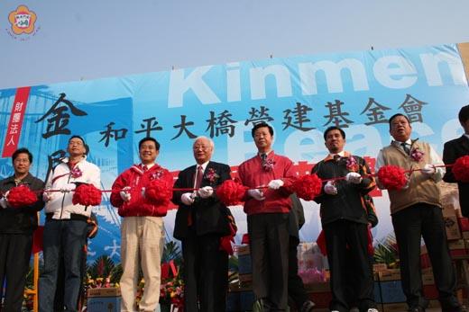 「財團法人金門和平大橋基金會」昨天在金沙鎮五龍山舉行成立大會。基金會的主要工作是要遊說兩岸政府,早日簽訂和平協定,批准金廈和平大橋的建設。 「金門和平大橋基金會」是一個民間組織,董事長是駱肇清。他昨天沒有出席成立大會,由副董事長莊苓宗代為宣讀致詞。致詞中說明,他因為認識金門縣長李炷烽和立委吳成典,知道金門需要一座橋,以解決電力、用水等經濟上、生活上的問題─把金門建設成兩岸和平的自由經濟貿易特區,因此他決定號召大陸台商及一群民營企業家,以兩岸民間的力量,來推動興建金門大橋。 推動中的金廈和平大橋,全長九點二公里,分為金門段和大陸段。金門段是由五龍山到海峽大線;大陸段是由海峽中線經角嶼、小嶝,再銜接大嶝的環島公路。 大陸段長七點九公里,由大陸的「金廈和平大橋投資管理有限公司」投資興建,最快明年可以動工。金門段是一點三公里,將由金門和平大橋基金會遊說兩岸推動。 在成立大會中應邀剪綵的人有:金門縣長李炷烽、立委吳成典、金門縣議長謝宜璋、行政院顧問翁明志、金沙鎮長陳昆第、中國民眾黨主席王忠泉、中華民國橋藝協會理事長、金門佛教協會理事長性海法師、中華心靈美全民推動協會理事長何若蘭、百里斯國家石油生產公司董事長楊禮綱等。 百里斯國家石油生產公司董事長楊禮綱曾經於中華民國三十八年在青年軍六零一師.六零二團.第二營.第五連擔任副機槍長,並參與了古寧頭大捷;四十七年,他任海軍二八九登陸艦的艦長,在八二三砲戰期間,於九月十八日晚上,在美軍第七艦隊的護航下,將八吋砲運到金門。他表示,他參加過金門兩次最重要的戰爭,因此有義務、責任,也有權利來為和平大橋奉獻。他現在是基金會的常務董事,他的企業,已在大嶝投資七十多億;希望未來能把大陸同胞帶到金門觀光、旅遊、購物。 金門縣長李炷烽昨天出席成立大會時表示:金門不必永遠是戰地!金門不必永遠是離島!金廈和平大橋是由政府推動,民間響應。 他說,自從金門議會提出金嶝大橋的建言之後,他就透過管道,與大陸保持密切。後來,北京公共交通研究院完成了建橋的規劃,去年五月,金門縣議長謝宜璋已沿著規劃路線用船走了一趟。八公里的距離,在技術上並不困難,問題在兩岸能否合作。 他表示,金門縣議會已經通過十二億元的預算,要先建設大、小金門的大橋,好協助兩位「騙人的總統」不失信於民。金門和平大橋基金會能以民間的力量 對於建橋一事,李炷烽昨天曾與總統參選人馬英九談過,馬英九的建議是開國際標。李炷烽希望金門和平大橋的興建,可以讓人類告別戰爭 迎向和平;讓兩岸不再戰爭,世界永享和平。 行政院顧問翁明志表示:金門過去的苦難,是國民黨要反攻,共產黨要解放所造成的。如今,金門正處在歷史上最和平的時刻;這幾年來,執政黨並沒有發動戰爭,而是在提倡和平,首先開放了小三通::。要說和平,不必說給台灣聽,而是要說給大陸聽,請他們不要再用武力解決問題。無論如何,人人都應該是和平大使。對於金門和平大橋基金會能用民間的力量,為政府推動困難的工作,人人都應該給予肯定。 立委吳成典表示:過去金門是打砲的地方,歷次戰爭讓金門怎麼看怎麼不像三民主義的模範縣。金門歷經多次戰爭,因此金門人沒什麼好怕的。金門雖小志氣大─凸顯金門,就是凸顯和平;凸顯金門,才能讓兩岸走向和平,走向成功。他希望有了和平大橋,可以讓金門開車到廈門,到武漢,到莫斯科,到西伯利亞-就像縣長所講的:金門不必永遠是戰地!金門不必永遠是離島! 金門和平大橋基金會成立大會昨天的活動包括:和平慢跑、祥獅獻瑞、剪綵啟動、敲響世界和平鐘、施放氣球、康樂活動等。
