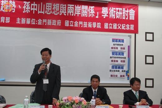 「全球化趨勢、孫中山思想與兩岸關係學術研討會」昨天在金門技術學院召開,縣長李炷烽表示,兩岸沒有進展,金門就沒有未來,期盼透過學者專家研討,提供政府施政的參考,使兩岸走向和平的未來。金門技術學院校長李金振指出,三民主義和共產主義在兩岸實施半個多世紀,應是交期末報告時候,小三通的金門願意提供寫歷史的舞台。 金門縣政府、金門技術學院、國立國父紀念館共同主辦的學術研討會上午九時在金門技術學院國際事務系階梯教室召開,由縣長李炷烽、金門技術學院校長李金振、國立國父紀念館館長鄭乃文共同主持開幕典禮,研討會有國內學者專家近五十人參加,進行四場、十五篇論文發表,探討全球化時代的孫中山思想、兩岸關係及小三通等課題。 李金振指出,中華民國已經有九十六年歷史,台灣比金門少了三十四年,中國大陸少金門六十二年,只有金門與中華民國是九十六年一路走來、始終如一,而金門在地理上是目前兩岸中心點,扮演交流重要角色。 他表示,中華民國在台澎金馬實驗三民主義,與中國大陸實行共產主義已經半個多世紀實驗,一般物理、化學的實驗結果都要寫報告,兩種主義動員上億人口實驗,實驗半世紀是到了應交期末報告時候。 李金振說,金門願意提供兩岸學者專家交流的舞台,讓兩岸學者專家發表研究成果,實驗沒成功要寫出來,如果有成果也要好好珍惜人類付出代價的結晶,對華人、全世界做出貢獻。 鄭乃文表示,金門是兩岸關係樞紐、橋樑,如同孫中山是兩岸非常重要的人物一樣,在金門舉辦孫中山思想與兩岸關係研討會意義深遠。 縣長李炷烽則指出,全球化趨勢、孫中山思想與兩岸關係學術研討會發表的論文有十五篇,其中至少有五個主題和金門息息相關。他說,金門走過五十多年烽火,深深感受到和平的兩岸關係就是金門未來的希望,希望藉由活動向世界發聲,唯有和平才有未來,沒有和平金門就沒有發展,兩岸沒有進展,金門就沒有未來,只有結合兩岸力量走向和平的未來。台灣發展一旦窒息,做為咽喉的金門首先遭殃,期盼透過學者專家研討,提供政府施政的參考,使兩岸走向和平的未來。這項研討會進行四場,十五篇論文發表,探討全球化時代的孫中山思想、兩岸關係及小三通等課題,會中發表論文的學者包括周陽山、范世平、樊中原、劉煥雲、陳建民等人,並邀請知名學者台灣大學國家發展研究所副教授何慶輝、中國文化大學政治學研究所教授呂亞力、台北科技大學教授周家華等人擔任講評。李金振期盼研討會能成為年會,並且邀請中國大陸學者專家參加。