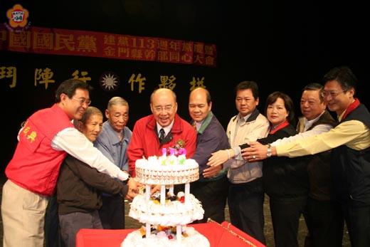 中國國民黨主席吳伯雄昨日來金輔選,參加黨提名立委候選人吳成典競選總部成立大會,並參加慶祝建黨一百一十三週年大會。吳伯雄誠懇籲請金門黨員和鄉親,立委選舉團結一致支持黨提名的吳成典,明年先打贏立委選戰;再繼續支持馬英九贏得總統勝選,讓國家重新出發,金門更有發展。 國民黨主席吳伯雄於昨日上午由中央黨部副秘書長廖風德等人陪同,搭乘最早班客機到金門,首先前往金城鎮民生路參加黨提名的吳成典競選總部成立大會,隨後轉往金門縣文化局出席建黨黨慶大會,發出「支持馬英九選總統、吳成典選立委」的動員令。 由於吳伯雄是國民黨首位參加金門黨慶大會的黨主席,受到在場的前福建省政府主席顏忠誠、金門縣長李炷烽、副縣長楊忠全、國民黨金門縣黨部主委江士良、副主委許玉昭、立委吳成典、金門縣民眾服務社理事長李錫榮、鄉鎮長李文俊、林金量、蔡輝詩、陳昆第、李成義、國民黨中央候補委員陳清寶、董清池、陳天成以及鄉鎮民代表會主席、鄉鎮民代表和黨員的熱烈歡迎。 吳伯雄致詞指出,十一月二十四日是中國國民黨的黨慶,每一縣市黨部都在慶祝建黨一百一十三週年大會,他特別來到離島金門與黨員一同慶祝黨慶,慶祝中國國民黨生日快樂,分享黨的榮耀與傳承。 吳伯雄主席指出,中國國民黨在這一百一十三年來,對於國家和民族的貢獻,民眾是很清楚的,但國民黨目前正面臨存亡的關鍵時刻,即將到來的立委選舉和總統大選,對於中華民國和國民黨來說,可說是背水一戰,只能贏不能輸,輸的後果是不堪設想。在面臨關鍵的時刻,他誠懇呼籲全黨同志基於愛黨和愛國的理念,人人有責來背水一戰,團結一致來贏得立委和總統的勝選。 吳伯雄主席表示,黨提名的立委候選人是經過黨內初選和民調以及黨員投票的結果,黨提名吳成典優秀同志來代表金門選區競選連任。 吳伯雄主席指出,立委選舉只剩四十八天,總統大選也只剩一百一十八天,接近倒數的關鍵時刻,可以看出民進黨會用盡所有手段,也會使用各種奧步,在這個時刻,一定要提高警覺,步步為營,希望在金門能率先開出漂亮的成績。 吳伯雄主席說,金門雖然票數不多,但所代表的意義卻非凡,金門在國家和兩岸關係扮演重要的角色,代表兩岸關係的指標在金門。尤其是馬英九如果當選總統,金門在兩岸關係的地位更形重要;他說,小三通具有省時、省錢優勢,無可取代的功能,馬英九當選總統,小三通功能一定強化,走得更通暢。 福建省政府前主席顏忠誠也表示,立委和總統大選兩項選戰正如黨主席吳伯雄所說的關係黨國生死存亡之秋,只能贏不能輸,他呼籲金門鄉親要捐棄一己成見,共同來為黨國努力,國家才有發展,金門也才會有未來和希望。 金門縣長李炷烽也以新黨黨友的身份應邀來參加活動,他說,黨的存在就是要聚結一群有志一同的人,共同來為國為民做事,在關鍵的時刻,不同的政黨相結合共同的力量和目標,為國家民族來奮鬥,他就是以這樣的理念和心情,站在金門未來發展的角度,拋開黨派、宗親的情結,沒有黨派之見,樂意全力支持國民黨提名的立委候選人吳成典以及總統候選人馬英九。 李縣長由衷的感謝金門鄉親給予他連任縣長的機會,他說,這六年來,在民進黨政府的政權領導之下,他最有感觸,這也就是他為何一定要拋棄政黨黨派之分、捐棄宗親的成見,願意支持友黨國民黨、支持現在最有機會改變國家和人民命運的中國國民黨。 縣長李炷烽肯定吳成典在國會為金門提出許多有利全民和金門長遠發展的法案,李縣長說,他身為縣政的推動者,更可以深刻了解到這些法案的重要性,如:攸關地方建設發展的排雷法案,國防部必須於一百零二年以前全部清除金馬地區地雷。五十年的地雷嚴重阻礙金門的建設發展,也殘害了鄉親的生命,吳立委能在任內推動該項排雷法案,解除了五十年來限制金門發展的枷鎖,金門的雷區不清除,金門永遠沒有發展建設的機會。 李縣長也感慨好不容易吳立委爭取通過的排雷法案,但國防部目前編列的預算卻沒有按七年計畫的經費來編列,執政的民進黨不得已只能接受立法,但一直在拖延,甚至準備在馬祖設立飛彈基地,因為民進黨要追求台灣獨立,他相信只要民進黨繼續執政,下一個飛彈基地的目標就在金門,金門好不容易脫離戰爭的陰影和苦難,追求和平,金門鄉親會堅決的反對在金門設飛彈基地,這也是他為何要支持國民黨提名的立委候選人吳成典以及總統候選人馬英九。他說,飛彈不應該設在金門或馬祖,台灣海峽、兩岸的對抗不是靠武力可以解決的,一定要兩岸協商、合作,邁向和平,才是兩岸人民之福。 副議長許玉昭,身兼國民黨金門縣黨部副主委,她也呼籲黨員同志要全力支持黨提名的總統候選人馬英九、立委候選人吳成典,讓國民黨在兩項重要選戰中贏得勝選。 吳成典也強調,他擔任立委五年多來,一直秉持「清廉」問政,光明磊落,從未接受過不義之財,可以對得起天、對得起地、對得起金門鄉親,他心心念念的不是為了個人自己,而是金門的整體發展;是真心的愛護金門這一塊土地,希望金門家鄉會愈來愈好。他拜託金門鄉親繼續愛護支持他,讓他有機會繼續為家鄉做更多事,只希望金門更好、國家更好。 黨慶大會上,吳伯雄主席與黨員合唱生日快樂歌、共切蛋糕,並且頒獎表揚績優義務幹部陳偉棠、盧陳根、陳西湖、李水泉、張含麗、