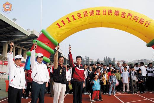 配合「1111全民健走日」,金門縣政府於昨日上午和全國各縣市同步舉行健走活動,縣長李炷烽、前福建省政府主席顏忠誠、立委吳成典、副議長兼婦聯青溪金門縣支會副主委許玉昭等來賓和三千多位的軍民大眾一同健走,一起為健康、幸福和快樂向前行。 由行政院體育委員會、衛生署國民健康局指導,中華健康生活與運動協會承辦的「1111全民健康日,快樂台灣向前走」活動,昨日上午八時在全國各縣市同步實施,一大早八點不到,來自各地的三千多位男女老幼運動同好者以及海、岸巡和地區駐軍、以及金門技術學院學生聚集在縣立運動場上,一同來參與健走活動。 縣長李炷烽率領縣府主任秘書盧志輝、教育局長李再杭等主管參加健走活動,國民黨籍提名角逐金門縣立法委員的吳成典,也帶著牽手鄧琰加入健走行列,為自己連任之路邁開大步。包括,福建省政府前主席顏忠誠以及許多機關單位首長也參與活動。 縣長李炷烽、立委吳成典、縣府主任秘書盧志輝、教育局長李再杭一同為健走活動鳴槍。李縣長一路帶領群眾向前邁進,不時與民眾打招呼,還親自走完全程,鼓勵大家多運動。他表示,大家都知道要活就要動,但現代人生活、工作忙碌,運動時間不多,以前的人常說的十一路公車(意即用兩腳走路),是最原始的交通工具,成了現代人最方便的運動方式,十一月十一日為全民健走日,歡迎大家以「11路公車」上路,走出健康,希望大家都運動,運動身體健康,身體健康家庭就會幸福和快樂。 立委吳成典也指出,不論是健行、登山,都是很好的活動。運動一上午,幫助身體流汗排毒,紓解壓力,希望大家用雙腳走出健康,少用健保卡。 由於適逢假日,參加健走活動的人潮有三千多人,許多民眾是全家人一同參加,大家由體育場出發,沿夏墅、延平郡王祠、賢厝、山前、莒光樓、天后宮、回到體育場,所行經路線,人潮浩浩蕩蕩的健走,人氣十足。婦聯青溪金門縣支會主委楊配治、副主委許玉昭也率領青溪姐妹來共襄盛舉,一起走出青春、健康與活力。消防局派出警義消來沿途「戒護」,縣立體育場也動員許多志工來協助維持交通秩序,並供應礦泉水,讓大夥補充體力再上路。 為鼓勵參與活動的人員都要走完全程,主辦單位也提供摸彩,有液晶電視、電冰箱、自行車以及電器等二百六十多份的豐富彩品,參與活動的人員必須在莒光樓前廣場服務台蓋上戳章,才有資格參與摸彩。在縣立體育場場長許換生的主持下,大夥人員聚集在籃球場等待幸運中獎,由教育局長李再杭等來賓抽出各項獎項的幸運者,壓軸的液晶電視、電冰箱,更為活動掀起高潮。