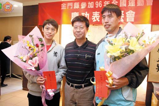九十六年全國運動會金門代表隊總計拿下一金三銀一銅,二個第四名,三個第五名與二個第六名。金門縣政府昨日在葡京舉辦九十六年參加全國運動會績優選手頒獎表揚餐會,縣長李炷烽頒獎時感謝體育界同仁對地區體育發展盡力推動,更希望藉由鮮花帶給我們努力、健康,也帶給我們信心與希望,期勉各單項選手和指導教練再接再厲,以為個人和地區貢獻最大的力量,爭取最好的成績努力以赴。 金門縣政府這項頒獎運動績優選手和感謝餐會,昨日中午十二時在葡京餐廳舉行,由縣長李炷烽頒發獎金予得獎績優選手及教練。金門技術學院校長李金振、縣府主任秘書盧志輝、教育局長李再杭、主任督學陳金文、課長許能麗、縣立體育場場長許換生及跆拳道、帆船賽、健美賽、自行車、田徑等各單項的競賽選手和教練等到場觀禮祝賀。 縣長李炷烽對於各單項運動選手和指導教練的付出和為地區爭取佳績表現表達感謝,由於大家盡心盡力的奉獻與鍛鍊,才有今天輝煌成績。李縣長指出這次頒發獎金有一百九十一萬元,每位選手也收到一束鮮花,希望鮮花帶給我們努力帶給我們健康,也帶給我們信心與希望,並期勉大家再接再厲,更上一層樓,更期待蘇麗文代表地區參加奧運會,為個人和地區貢獻最大的力量,爭取最好的成績努力以赴。 今年參加九十六年全國運動會得獎選手計有女子跆拳道一面金牌(蘇麗文),三銀(男子組田徑一萬公尺、五千公尺、三千公尺障礙賽何盡平),一銅(男子健美李政傑),二個第四名(男子健美涂晏瑜、女子自由車下坡賽陳如妙),三個第五名(帆船女子組葉惠文、男子健美汪在莒、三千公尺障礙賽黃世昌)與二個第六名(帆船男子組江嘉佑、男子組田徑一萬公尺何盡文)。 值得一提的是,地區今年由跆拳道輕量級選手蘇麗文成就了個人的「五連霸」,為金門保留一面金牌,銀牌也有大進帳,由長跑選手何盡平一人包辦三面銀牌,表現相當傑出。