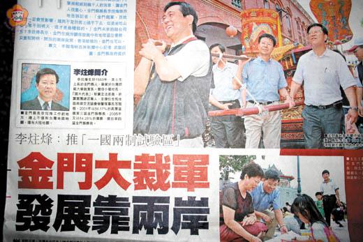 香港文匯報在十月十五、十六、十七日以「硝煙散盡看金門」為主題,以六大版面、六個系列介紹金門。其中,十六日刊出系列六之四「前進大陸」,則專訪縣長李炷烽,談推動「一國兩制試驗區」的構想,以及對金門未來的規劃。 這篇標題為「李炷烽:推『一國兩制試驗區』─金門大裁軍,發展靠兩岸」的主題報導中,縣長李炷烽談起中央自金門裁減駐軍問題,他認為,看不到明天,才是最糟糕的事。對於金門未來的出路,他表示,金門在兩岸關係發展中,有地理區位的優勢,只要有開明、開放的兩岸政策,香港能做的,金門也可以。 李炷烽說,金門只有取得特區地位,朝非軍事化、和平發展的訴求走去,才能改變現狀,事實上就是「一國兩制試驗區」。 李炷烽在訪談中強調,金門若能作為「一國兩制試驗區」,將積極爭取兩岸立法機構的授權,設立相應的專題研究計畫,並以小三通為突破口,加強經貿的全方位合作,最終將金門建設成台灣法制背景下的大陸沿海特區。 觀光發展是金門未來的產業重點,不過,李炷烽指出,循小三通管道到金門旅遊,目前還沒有真正暢通。過去兩年來,大陸遊客到金門旅遊的人數,僅是去年到港澳自由行遊客的百分之一。他分析,開放程度不足和政策變數帶來的不便,是導致遊客數量少的根本原因。 李炷烽表示,將適用小三通的觀光客擴大到福建省外的大陸地區,開放福建居民到金門旅遊的自由行,或開通金馬澎湖的一線旅遊,均會對金門經濟現狀有較大幫助。 而在專訪中,記者也提及李炷烽的貧寒家世,因父親臥病在床,從小就要跟著母親下田幹活,才能勉強糊口,連自家母雞生的蛋都捨不得吃,拿來換取一家八口的油鹽醬醋。也由於從小吃盡苦頭,讓妻子吳麗鳳感嘆,或許是因為小時候吃了太多苦,習慣了,現在再怎麼累也都不會抱怨辛苦。 至於卸任後的計畫,李炷烽笑笑表示,不再從政了,賣麵條、寫字、照顧孫子都可以。