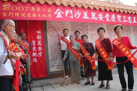 「文山丞相翰墨香,張陸二公聚升堂;分明公義無可比,文士武備兼英雄:::」這是萬安堂︿迎請三忠王咒語﹀中的一段。萬安堂的文化照牆於昨天揭牌,文天祥的︿正氣歌﹀、萬安堂的︿迎請三忠王咒語﹀、︿三忠王初來沙美之歷史乩示原文﹀、︿勸世八箴﹀等文獻,都被刻石永傳。 「二零零七年第二屆金門傳統道教文化觀光祭暨慶賀萬安堂三忠王聖誕活動」昨天進入高潮。除了巡安遶境的傳統儀式之外,萬安堂勸世八箴文化照牆上的石刻,一一揭牌。牆分兩面,正面的內容包括:︿金門沙美萬安堂勸世八箴序﹀、︿八箴﹀(篤孝行、勸積善、慎交遊、務勤儉、戒酗酒、戒漁色、戒貪財、戒任氣)、︿回顧萬安堂歷史軌跡﹀;背面的內容包括:︿萬安堂勸世八箴籌建委員會﹀、︿勸世八箴文化照牆捐款功德主﹀、︿三忠王初來沙美之歷史乩示原文﹀、︿文天祥正氣歌並序﹀、︿陸秀夫獎諭文天祥詔﹀、︿紫微廂功德碑﹀、︿三忠王石雕聖像﹀。萬安堂的三忠王就是宋末三傑:「文天祥、陸秀夫、張世傑」︿正氣歌﹀是宋文天祥被元人羈囚時所作,共有三十韻。 立法委員吳成典昨天參加「金門沙美萬安堂三忠王聖誕暨文化照牆剪綵揭牌典禮」時表示:這是一個創舉,很不簡單!金門縣議員楊應雄也認為,文化照牆的設置,對知識份子會更有吸引力。 照牆剪綵揭牌典禮辦得很熱鬧,所有曾為萬安堂出錢、出力的人,都被安排揭牌。除了萬安堂主委張雲盛、副主委莊木水和萬安堂全體人員之外,金門縣副縣長楊忠全、立委吳成典、金門縣議員王再生、楊應雄、金沙鎮長陳昆第、烈嶼鄉長林金量等,都躬逢其盛。