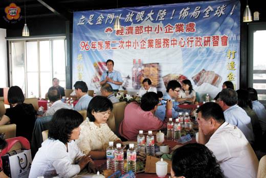 經濟部中小企業處九十六年第二次中小企業服務中心行政研習會,昨天跨海抵金在金城長鴻商務旅館餐廳召開,各縣市中小企業服務中心幹部與工作人員參與,縣府主任秘書盧志輝代表李縣長前往致詞指出,戰地政務解除後駐軍也減少了,衝擊到各行業經濟蕭條,縣府致力發展觀光事業,期望營造出具有文化及時代特色的觀光城,也歡迎全國各地中小企業服務中心人員來金門體驗金門之美,藉由彼此交流與經驗的分享,提升地區觀光事業,活絡商機。 這項由經濟部中小企業處主辦、金門縣工商發展投資策進會協辦、金門縣中小企業服務中心承辦的中小企業服務中心行政研習會,於昨日下午二時在金城長鴻商務旅館六樓餐廳舉行,研習會由經濟部中小企業處副處長葉雲龍主持,縣府主任秘書盧志輝、建設局長李增財、經濟部中小企業處副組長蘇文玲、科長葉秀娟、金門縣中小企業服務中心主任盧志權及各縣市中小企業服務中心幹部與工作人員近六十人參與。 九十六年第二次中小企業服務中心行政研習會,會中並報告去年度提案執行情況,並提案討論通過二項提案,昨天下午也進行專題演講,分別邀請經濟部中小企業處副處長葉雲龍主講「積極落實中小企業之六項策略及四大配套方案」、金門縣建設局長李增財演講「金門產業概況與未來發展方向」,金門縣中小企業服務中心主任盧志權配合經濟部投資業務處及金門縣政府招商案,說明如何招商引資推介金門投資環境,包括有水試所觀光旅館、高職農場及金湖商業旅館等等,同時對有意願來金投資,國內、國外及大陸地區(台商)等財團企業,提供資訊與諮詢服務,帶動地區各項建設,繁榮經濟。 建設局長李增財演講「金門產業概況與未來發展方向」時表示,政府首要之務是塑造一個有利於產業發展,調整轉型之大環境,讓產業永續進行,而要達到此目標除了縣民共同推動與努力外,重要的是中央政策要鬆綁,我們就可全力以赴,一起來為地區觀光事業打拚,發展出具有文化及時代特色的觀光城。