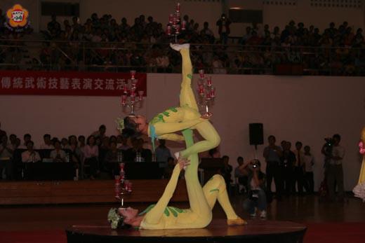 由大陸福建省體育總會組成的交流團與金門學校民俗團隊攜手演出的海峽兩岸民間傳統武術技藝交流活動,昨天分別於烈嶼鄉體育館與縣立體育館熱鬧登場,盛況空前,展現出高難度的技巧、武術成果,難得一見的功夫表演讓地區民眾一飽眼福 。 福建省文化體育交流團四十七人,是由福建省體育運動總會副主席孫君梅率領,昨日上午搭乘金廈航線班船到金門水頭碼頭,隨即在碼頭換船轉往離島烈嶼鄉,展開首場交流活動。這次應金門體育會邀請到金門交流,是由福建省的雜技團、傳統武術隊、技巧隊、業餘搏擊隊等組成,均是福建著名的民間技藝團隊,受到縣長李炷烽和鄉親的歡迎。 縣長李炷烽致詞代表鄉親感謝福建省體育運動總會成員帶來盛況空前精彩的演出,鄉親給予掌聲表達歡迎與感謝,更期待下次再帶來精彩演出。李縣長說,金門在文化、藝術、體育、音樂各方面都已經逐漸在金門每個地區開花結果,這是大家努力所換來的成果。希望金門永遠保有這樣的承平,讓孩子能夠健康快樂成長,這是我們的心願、祝禱,並再次對這次精彩演出表達感謝。 福建省體育運動總會副主席孫君梅表示非常高興到金門進行這項體育文化交流,更感謝金門鄉親熱情的接待。她說,福建省體育總會是繼去年七月之後,第二度組文化體育團到金門交流,不但有去年的技巧隊,還增加散打搏擊、武術、雜技等團隊,希望透過交流帶給金門鄉親歡樂,促進兩岸文化體育的發展,使得兩岸體育文化更加發揚光大。 這項由金門縣政府主辦、金門縣體育場承辦的海峽兩岸民間傳統武術技藝交流活動,昨日首場跨海抵烈嶼鄉體育館登場演出,首先由卓環舞獅、西口的宋江陣的表演活動歡迎遠方的朋友到來。鄉長林金量中午除擺桌熱情接待外,同時也感謝吳成典立委大力協助爭取,安排武術技藝表演第一站就前往小金門帶來絕佳的精彩演出,讓鄉親大飽眼福,縣長李炷烽、教育局長李再杭也陪同鄉親一起觀賞,鄉長林金量致贈「烈嶼之友」紀念牌、鄉旗感謝交流團精彩演出。 晚間在金門縣立體育館舉行第二場交流活動,金門中正國小舞獅陣參加交流演出,中華武術散打搏擊協會派出選手范仲杰、王中原與福建省業餘搏擊隊胡景元、楊朝財做搏擊對打表演,精彩演出擠爆體育場,高難度動作的演出博得鄉親熱烈掌聲,讓金門民眾大開眼界。 2007海峽兩岸民間傳統武術技藝展演交流活動,第三場於今(十三)日晚間七時三十分在金湖鎮新市里籃球場舉辦;第四場明(十四)日晚間七時三十分在金沙國小複合式運動場舉行,此次交流演出精彩可期,完全不收門票,歡迎民眾踴躍觀賞。像在技巧運動上,有連續十五屆中國技巧運動大賽冠軍隊演出。而雜技表演,則由獲得多項國際雜技大賽金牌及大獎之雜技團體,將帶來絕佳的精彩演出,讓地區民眾一飽眼福。