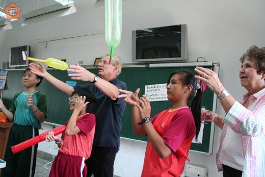 傾耳難懂美國話,開眼卻見大氣壓;老外授課多互動,高深問題淺顯答!馬汀和康玫夫婦昨天在金沙國小示範美式教育,六年級的學生,對美國話雖然是一知半解,卻可以在美式的科學課程中,學得津津有味,因為自始至終,上課就像做遊戲。 由金車教育基金會、金門縣教育局所辦理的「生命科學向前衝」美式教育研習活動,昨天在金沙國小舉行。這項研習計畫是為了提升學生和教師對生命教育及自然科學的認知,並希望引進不同的教學方式。 馬汀在美國任教已二十多年,對象主要是國中生;康玫任教已三十多年,對象主要是國小學生。昨天為金沙國小六年級所上的科學課程,主要與大氣的壓力有關。馬汀是主講,康玫是助教;金車教育基金會的張孋和替代役男黃偉倫則在必要時,進行翻譯。金沙國小校長楊肅正、金門縣教育局督學陳清纓也列席旁聽。 馬汀全程用美國話講課,小朋友不全然懂,也不全然不懂;不過,因為馬汀的動作、表情、聲音,以及各種道具的運用,吸引了學生的目光,時時都有驚奇和歡笑,語言反而沒有那麼重要求。在上課期間,他最常說的就是:「Scientists ask questions.」「Scientists try to find arswers.」他希望學生們像科學家一樣,要勤於問問題,勤於發現答案。 上課前,馬汀和康玫花了很多時間在整備教具。上課之後,馬汀先拿著氣球幫浦(打氣筒),把氣打在學生感覺得到的地方,告訴他們這是「air」(空氣),那是「air pump」(空氣幫浦)。他讓幾個學生一起為氣球打氣,再釋放氣球,讓氣球一邊發出「嘟|」的聲音,一邊鑽天而去;學生們在一開始就學得好好玩。接著,他在黑板上畫出氣體在氣球內運動的方向,解釋氣球為什麼會鑽天。 另一個實驗,馬汀拿一個五個人長的塑膠袋,讓一名小朋友用吸管吹氣;小朋友吹了十六次之後,才讓塑膠帶充滿,但馬汀用口隔著袋口,吹一口氣,氣流馬上就充滿了塑膠袋。 馬汀表示,這些空氣壓力的原理,和飛機之所以會飛的原理是一樣的。當他對塑膠袋口吹氣時,改變了袋口的壓力,外面的空氣就迅速由高壓流向低壓,因此袋子就充滿了空氣。同理,機翼有一面是弧線,一面是直線;通過弧線的空氣速度變快,氣壓變小,飛機就飄浮起來了。 為了說明空氣的壓力,馬汀還用通馬桶的吸盤吸取物體;用吹風機的熱風吹入天燈狀的塑膠袋,讓塑膠袋升空;讓被熱風吹拂的乒乓球停滯在半空:::。此外,他還用很長的彈簧玩具(Slinky),讓學生「看到」聲波。聲波是不可見的,但聲波的大或小、高頻(高音)或低頻(低音)。 還有一個兼具科學原理與人生哲理的實驗;馬汀把大小不同的四個球串在一根棒子上;這四個球,每個球在落地時,反彈的力量都不同;彈力最佳的小球落地反彈時,也不會超過一個人高,但是當四個球成串往地擲時,最上面的小球,卻因為綜合了四個球的反彈力量,可以彈到了天花板上。馬汀藉此表示,每一個家庭,每一個國家中,每個成員的能力不同,但團結起來,力量就會變得非常大! 昨天的示範教學是針對學生,今天將針對教師。在馬汀的課裡,學生沒有一刻是閒著的;他會持續引起學生的注意,甚至用拋繡球的方式,隨機挑選學生加入示範的行列。 馬汀表示,教育就是要培養學生活老到學到老的精神。他的教學方式,最強調生活上的運用,不希望課堂中所教的東西與生活脫離;這樣,學生才能在現實生活當中,不斷去運用和複習所學的觀念。 在教學過程中,馬汀認為學生比老師的責任還要重要;學生必須要努力把知識學到手。