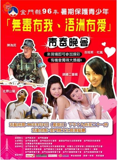 由金門縣政府社會局、教育局結合檢、警機關主辦的一場金門縣九十六年暑期保護青少年「無毒有我、浯洲有愛」青春晚會活動,訂於九月二日晚間在金門縣文化局演藝廳熱鬧舉辦,將邀請國內歌壇頗具知名度多位歌手、團體,將目前流行樂曲做最完美的呈現,同時加強「反賄選、反詐欺、反煙毒、反飆車、反援交」相關宣導,歡迎青少年學生及社會大眾屆時踴躍到場參與。 這項由金門縣政府社會局、教育局、金門縣警察局、福建金門地方法院檢察署共同主辦,救國團金門縣團務指導委員會承辦,金門縣衛生局、金門縣文化局、金門縣學生校外生活輔導委員會、財團法人犯罪被害人保護協會金門分會、福建更生保護協會、金門觀護志工協進會共同協辦的金門縣九十六年暑期保護青少年「無毒有我、浯洲有愛」青春晚會活動,活動並安排於九月二日晚間七時至九時,在金門縣文化局演藝廳登場。 金門縣政府指出,這項活動舉辦目的,係為積極預防青少年偏差行為,加強宣導反賄選、反詐欺、反煙毒、反飆車、反援交等五反活動,全力防範青少年觸法,營造優質成長環境,並為確保青少年暑期等活動安全,維護身心健全發展,積極結合中央與地方政府,全力規劃充滿力與美的晚會活動。 活動將邀請國內歌壇頗具知名度之歌手、團體,將目前流行樂曲做最完美的呈現。這些受邀的國內歌壇頗具知名度之歌手、團體,預計包括有:錦繡二重唱、北原山貓、吉娃斯、杜嵐、陳為民:::等。 這項活動,並有摸彩和有獎徵答,歡迎社會大眾及在學青年,屆時踴躍到場參與。主辦單位希望藉由晚會藝人的宣導,建立青少年正確之「反賄選、反詐欺、反煙毒、反飆車、反援交」的價值觀,期能更健康、快樂、成長。