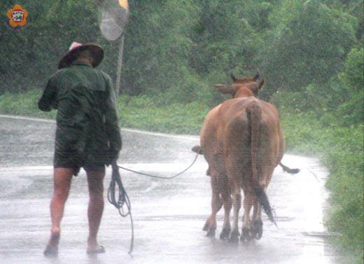 聖帕颱風過境,在「風」雨中,農人牽著子母「牛」從大「馬」路轉進山后的鄉間小路。小牛似乎以母牛的軀體為避風港。 颱風過境,下午三點半左右,三山里的聯外道路上,冷冷清清,主人帶著牛隻,消失在鄉間小路。