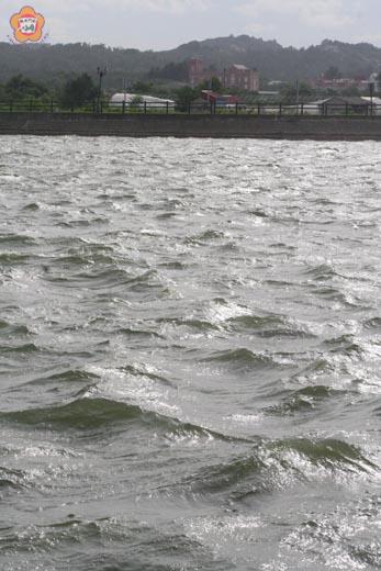颼颼颯颯,波波漉漉! 聖帕颱風來襲,昨天上午八時,金沙水庫的水是由出海口往陸地的方向。從出海口看水庫的水,波動並不明顯;從第二富康農莊的方位往水庫看去,則可看到水波被氣流趕得很「忙碌」,有「峰峰」相連的情景。堤岸邊因為水氣飄散,近身會有溼漉漉的感覺。