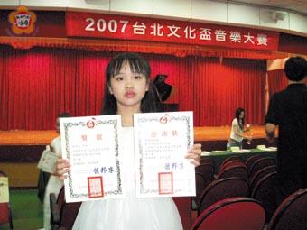 中正國小五年級的成欣玫(見右圖,樂坊提供),練了一身好琴藝,日前以蕭邦的「幻想即興曲」在台北文化盃的全國鋼琴比賽中不但以黑馬之姿,取得初賽第一名,更進一步在總決賽中勇奪國小五年級組全國鋼琴比賽第一名,中正國小全校師生與有榮焉,也為金門地區爭光。成欣玫小小年紀,彈起鋼琴來,指法和感情十分的投入,將會是鋼琴界的「明日之星」。 成欣玫五歲開始學鋼琴,由雅韻樂坊老師梁明玲啟蒙,奠定了非常穩固的基礎。歷年來曾在金門縣第二屆鋼琴比賽國小低年級組第一名,第三屆金門鋼琴比賽國小中年級組第一名,第四屆鋼琴比賽國小中年級組第二名,並且多次參與全國性之比賽亦是年年獲得殊榮,2004榮獲全國音樂選拔賽鋼琴類D組北區第三名暨全國第三名,2005勇奪台北文化盃國小三年級組第一名,國小四年級時榮獲2006第五屆亞洲明日之星全國音樂選拔賽鋼琴類4至6年級組|北區初賽暨複賽金獎,決賽第三名;2006台中文化盃國小四年級第三名;並且因為多次獲得第一名殊榮,在2004年更是獲邀在金門縣政府為鋼琴比賽冠軍得主所辦的「浯島冬之戀音樂會」上擔任獨奏。 成欣玫的啟蒙老師梁明玲說,成欣玫一向是多元化的吸收學習,因為她本身從小對於藝術的領悟性高,所以在美術、音樂方面皆有不錯的成績,在美術方面,2006年榮獲金門(民俗文化村)文教基金會「五虎生風山后古厝」寫生比賽全縣不分組第一名佳績;2007年榮獲「金城海濱公園花海造景」寫生比賽國小組第二名。而音樂更是他一直堅持不懈且熱愛的一項才藝,目前在中正國小的管樂團中擔任打擊樂手,並調派至金城國中參與打擊部的演練。 成欣玫的父親成勇山相當高興女兒有優異的琴藝表現,他說,由於金門地處離島,往往為了一場比賽,台金奔波實在辛苦,甚至有一次比賽,因為遇到氣候不佳飛機無法起降導致錯過比賽,但是小孩卻還是願意堅持下去,看在大人的眼裏,當然更是應該要全力支持她囉!成欣玫在藝術方面在在展現出過人的天份,成勇山夫婦對於女兒的表現,心中的喜悅是不可言喻,更期望繼續更上層樓,在全國性或是世界性的比賽中,繼續為金門爭光。