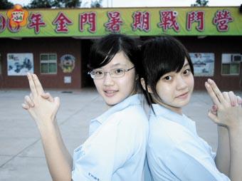 梁惠婷姐/木柵高工 梁惠鈞妹/木柵高工 「當初看到學校公佈欄的宣傳海報,再加上又有親戚在金門,一定就要順道來看看囉」!可別以為惠婷、惠鈞姐妹倆看似柔弱,她們不但選擇了難度最高、操課過程囊括海陸空三棲的金門戰鬥營,最期待的課程還是實彈射擊與搭乘海龍快艇乘風破浪踏上小金門呢!可見連袂挑戰金門戰鬥營的惠婷、惠鈞姐妹倆,表現一定會令男生刮目相看!