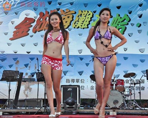 陽光、沙灘、比基尼!2007溪邊海洋音樂祭昨開幕,台中知名舞團(三女一男)帶來嘻哈熱舞秀,金湖鎮鎮長李成義也上台同樂;辣妹比基尼泳裝秀,飽足現場男性的目光,也為開幕活動掀起高潮!而整個海洋音樂季活動,在地主赤后樂團開場演唱下,正式揭開序幕,親子假日夜晚,海濱悠遊。 2007溪邊海洋音樂祭昨日下午六時起辦理開幕活動,在主持人穿針引線下,金湖鎮鎮長李成義,依序介紹現場貴賓,包括縣府主任秘書盧志輝、財政局局長李增財、林務所所長葉媚媚、農試所所長胡錫載、畜試所所長陳世保、動植物防疫所所長莊謙恭、縣議員李沃士、金湖國中校長吳啟騰、金城鎮鎮長蔡輝詩、金寧鄉鄉長李文俊、縣警局局長林文全以及金湖鎮代表會主席呂瑞泰、副主席翁伸金等。 海濱音樂季熱鬧登場,金湖鎮鎮長李成義表示,擁抱海洋、體驗金湖海濱之美,歡迎所有鄉親到場同樂,親子在沙灘上嬉戲、乘坐沙灘車玩樂,歡樂一「夏」,也呼籲前往海灘玩水的朋友,要特別注意安全,祝福大家能玩得盡興。 縣府主任秘書盧志輝表示,現場陽光熱力無限,看到廣闊的海濱讓人心曠神怡、心胸舒暢,金湖鎮海濱活動自花蛤季活動後揭開序幕,陸續登場,提供民眾夏天海邊玩樂的好去處。 李沃士也表示,金湖鎮帶領地區海洋活動往前衝,入夏後規劃一系列海濱活動,讓民眾能夠體驗各種水上活動,也提供民眾一個貼近海洋的場域,祝福活動圓滿成功。 金湖鎮代表會主席呂瑞泰指出,2007溪邊海洋音樂季活動可以媲美墾丁的春天吶喊活動,現場有台、金樂團演唱,也有泳裝秀和嬉哈舞蹈表演,希望所有熱愛海洋、音樂及水上運動的鄉親,前往體驗現場的歡樂氣氛。 2007溪邊海洋音樂祭昨日開幕,時間自下午六時起,金湖鎮公所規劃一系列開場表演節目,計有中正國小舞獅表演,由中部知名舞團(三女一男組合),擔崗演出二支街舞,金湖鎮鎮長李成義也受邀上台同樂,與舞者飆舞,與會民眾及貴賓以掌聲給予肯定。 開幕活動中,六位台籍辣妹,身穿比基尼泳裝走台步,為活動掀起一波高潮,也讓現場男士們大飽眼福,人人拿起相機猛拍照。 在所有表演節目後,地區著名樂團赤后樂團,延續前晚熱力演唱後,現場開唱多首曲目,也為昨日海洋音樂季活動正式揭開序幕,除了有樂團獻唱外,主辦唱位也邀請今年度參加第一屆歌唱大賽前十六強選手現場演唱,讓錯過歌唱大賽的民眾,能一睹他(她)們風采。 昨日計有莊煥智、蕭融融、周振偉等三位動感連唱,先後由莊煥智演唱「故鄉的地圖」、蕭融融「What」s up」、周振偉「one night in北京」等,博得滿堂采。 最後,由Rock king樂團現場演唱,民眾呼朋引伴前往參與,在沙灘上,聽音樂,與台上歌手及樂團同樂,渡過炎夏夜晚,樂聲、歡呼聲陣陣響,現場氣氛high翻天。 金湖鎮公所表示,錯過昨日活動的鄉親,今晚七時起仍有精采活動,歡迎前往同樂。另有園遊會、香蕉船、沙灘車、馬車等活動,有興趣的民眾可別錯過了。 而礙於會場交通擁擠,鎮公所於溪邊村口由警方協助疏導交通,並派接駁車載送民眾抵達活動現場,敬請民眾多加利用。