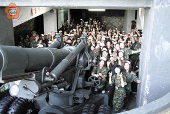 ︻本報訊︼「敵軍猝然對我實施砲擊,通信中斷狀況下,各級部隊均無法接獲反制射擊命令,在聽見反擊的怒吼後,便紛紛實施反制壓射擊,故此『一呼百應,快動猛打』便成為金指部砲指部的精神口號,鼓舞著我們延續四十八年以來,鎮守浯洲的神聖使命!」這座砲陣地座落於獅山砲陣地內,八吋榴砲就架設於砲堡,對岸火光熊熊,所有人屏氣凝神,彷彿一場激烈的戰鬥就要開始,大家都做好了壯烈犧牲的準備:: 教官活靈活現的講解,搭配狀況下達與砲兵弟兄扎實操作,一座笨重的八吋榴砲,頓時散發出它冰冷外表下所蘊藏的熱情,入戲的同學們彷彿掉入時光隧道,遙想當年砲戰,國軍奮勇隔海對共軍開火的畫面,是多麼豪氣萬千。 教官詳細說明八吋榴砲的歷史,讓大家實際了解這座冰冷的龐然大物,需要多少人才能夠操作,只見操演官兵的戰技動作純熟,砲兵弟兄在砲長的指揮下各司其職,不管是發射手、裝填手、信管手,或是瞄準手,只見弟兄們口令洪亮精神抖擻且動作精準到位,彷彿一台機器運作般精確無比,博得學員們一致的喝采。 操演後,同學們都表示意猶未盡,幹部選出「幸運」的學員,上場實際擔任砲手職務,親手感受拉發火繩,雖然只是發出聲響的底火試拉,由於重砲氣勢懾人,許多同學難掩緊張,而忘記了拉底火的訣竅,總是施力不足沒有觸發底火,果然需要藝高人膽大才能操作一座重炮啊! 最後教官帶領學員踏上陣地旁的瞭望台,用望遠鏡捕捉金門離島與大陸沿岸態勢,大家對兩岸的咫尺之隔感到訝異,更對砲戰時兩岸的緊張局面有了更具體的想像。面對重砲當前,學員們紛紛把握這難得的機會,與砲戰英雄八吋榴砲搭配前線風光為背景合照,留下大家在前線的難得倩影。
