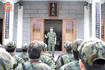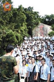 ︻本報訊︼在早餐後,學員們搭車前往太武山忠烈祠,憑弔823砲戰將士英靈,當軍卡緩緩駛入忠烈殿園區,片片白色所暈染的太武山靜靜佇立在側,學員們也被穩重莊嚴氣氛所感染,紛紛屏氣凝神踏進祭奠會場。 學員列隊整齊後,接著舉行簡單而隆重的祭奠,由帶班幹部與學員代表首先向烈士靈位上香、獻花、獻饌,並率領全體與祭人員,向烈士靈位行三鞠躬禮,稍後,全體人員亦徒步至墓園,循著林立的墓碑,在每位烈士墳前上香、獻花,對於烈士們浴血奮鬥求勝才能換取台灣四十多年長治久安,表達由衷的緬懷與追思,也期待兩岸的砲聲不再響起,兩岸戰爭的悲劇能夠永久走入歷史。雖然年輕的學員們從小沒體會過戰爭,但大家都很投入現場莊嚴肅穆的氣氛,虔誠的敬念感佩之意寫在臉上。 隨後教官帶領學員們,從園區旁的玉章路攀登「金門第一高峰」太武山,由於山勢陡峭,大家一路上走得汗流浹背,許多跟不上隊伍的學員,教官們也都很有愛心地給予扶持。在途中,學員們被一座巨幅的刻字「毋忘在莒」所吸引駐足,深感當年將士們的豪氣干雲,於是大家就在這鬼斧神工的石刻旁留下難得的倩影。接著,學員們都不忘繼續後半段的山路,全員士氣高昂,奮力抵達終點海印寺,此時金門的景色一覽無遺,學員都說,不枉費爬這一趟,流汗還是有成果的,大家都實踐了挑戰金門的初衷!