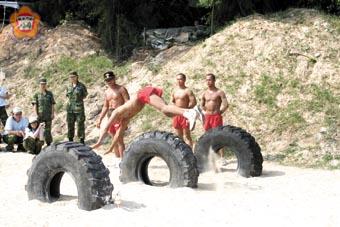 ︻本報訊︼天天都精采的金門戰鬥營昨(11)日邁入第四天,課程中綜合軍事歷史感懷、特戰部隊勇猛慓悍與老街采風知性之旅等各種面向,期藉學員們禮敬將士英靈激發愛國意識、操作特戰戰技體認官兵戍防海疆的辛勞、參觀文化遺產感受金門之美,透過以上「寓教於樂」的課程,從多面向培養「國防安全人人有關,國防建設人人有責」的共信共識,使全民國防的理念紮根於青年學子心中。 回憶起八二三砲戰可說是我國國防的一次嚴厲考驗,在「同島一命、生死與共」的同仇敵愾下,國軍通過了那次考驗,也奠定了台海日後繁榮安定的基礎;為使學員感念先賢先烈的貢獻,上午第一個行程「祭奠忠烈慰英靈」,學員們前往「太武山忠烈殿」,祭奠在八二三戰役中為國捐軀的將士英靈。隨後攀登太武山,於「毋忘在莒」勒石前誓師,並俯瞰金烈水道兵要履勘。下山後參訪金門民俗文化村,透過解說員的詳盡分析將文化村的由來與金城鎮老街的風采相呼應,使學員更深入感受金門蘊藏的文化內涵。 提起兩棲蛙人,不難想像到「黝黑的皮膚、精壯的體格、身著紅短褲、腰間插短刀」,蛙人憑著超乎常人的體力、熟練戰技,完成許多「不可能的任務」,成為國軍官兵奮戰不懈的精神表率。為使學員感受蛙人的英勇,在下午「鐵漢御風衛海疆」的課程中,學員將前往料羅灣的兩棲蛙人基地,實施兩棲作戰戰技演練及相關裝備展示;學員們均親身參與兩棲作戰基本戰鬥教練、蛙人操基本動作實作與觀賞蛙人操、莒拳道、格鬥、擒拿術等戰技演練,體驗兩棲蛙兵屏衛海疆堅實戰力與決心。 金門除了豐富的軍事景點與戰鬥氣息之外,也蘊涵世上鮮有的閩南與僑鄉文化。為增進學員對金門之美的深刻體驗,特別於晚餐後安排老街采風知性之旅,由觀光局解說員引領,參訪金城鎮模範街、貞節牌坊,近身感受閩南風情建築之美與豐富的金門人情風采,享受一場文化的盛宴。