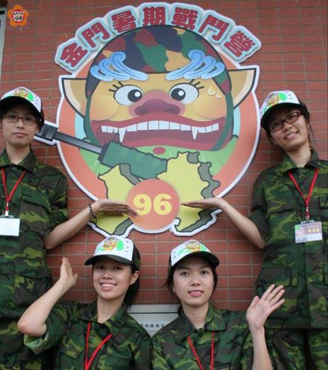 砲戰光輝耀寰宇,擎天軍威震九州;鐵漢御風衛海疆,金戰營隊入浯洲!九十六年金門戰鬥營的第一梯隊已昨天進駐金門島;六天五夜的課程包括「砲戰光輝耀寰宇」、「鐵漢御風衛海疆」:::等。 一百三十三位由高中職及大專院校所組成的金門戰鬥營隊,昨天下午搭乘軍機,分三班抵達金門。昨天,他們先完成編組及裝備領取,並與幹部、同志們肝膽相照;今天上午八點,他們將參加在擎天廳舉辦的開訓典禮,並接受為期一周的軍事生活體驗。 國防部陸軍金門防衛指揮部為金戰營規劃的課程分為五大主題,包括:擎天軍威震九州、碧血丹心照汗青、百戰菁英震天威、固若金湯作干城、雷霆萬鈞志千里。 「擎天軍威震九州」就是報到的第一天。學員們於台北松山機場報到,並搭乘C-130軍機抵達金門軍機場,嗡嗡的飛行,落地後的熱流,顛簸的卡車,讓他們一開始就有不同的感受。從軍機場被接駁到中心教練場之後,開始接受編隊,領取裝備,並認識中心教練場的營區環境及相關人員。對這些年青學生而言,第一次就想要合宜地穿好迷彩裝還真是不容易,必須互助合作才能穿好它,因此一開始就有了「手足情深」的互動。未來一周,他們將在團體生活中肝膽相照。 金指部主任陳世團、副主任范佐驊昨天各在機場和中心教練場歡迎這些青年。陳世團希望藉由金戰營活動,讓青年學子認識全民國防,支持全民國防;認識金門,愛上金門。 「碧血丹心照汗青」是今天(第二天)的課程,內容包括:擎天廳開訓典禮。坑道震撼戰鬥教練操作(第一線據點戰鬥教練原則講解、海岸線攻防射擊模擬)。喊話裝備系統操作及參觀馬山據點(眺望大陸)。八二三戰史館、古寧頭戰史館及北山洋樓古戰場參觀(回程安排參訪金酒公司)。團輔活動(金門簡介影帶收視、團康表演)。 學員們上午將在馬山喊話站模擬心戰喊話,並在「天下第一哨」(馬山海防哨所)實施「坑道震撼戰鬥教練」,體會與陣地共存亡的氛圍。下午藉戰史館等戰史遺跡的巡禮,體會「國家興亡,匹夫有責」的情操。 「百戰菁英震天威」(第三天)的課程包括:百戰精英震天威(65K2步槍性能諸元的介紹、操作、保養;射擊預習與各式輕兵器陳展介紹)。百步穿楊建奇功(實彈射擊)。砲戰光輝耀寰宇(獅山砲、鵲山砲砲操示範、演練)、老街采風知性之旅。 在第三天中,學員們將於上午學習國造65式K2步槍的射擊方法,並於下午在珠山靶場實施實彈射擊。 「豪氣干雲慶太平」(第四天)的課程內容包括:祭奠忠烈慰英靈(忠烈祠)。「登高觀心向海印」(含太武山毋忘在莒石碑誓師、金烈水道兵要履勘及金門文化村參訪)。鐵漢御風衛海疆(兩棲作戰基本戰鬥教練實作含裝備陳展與莒拳、格鬥、擒拿術戰技操作演練及驗收)。觀測所夜間戰鬥教練演練(含觀測裝備、夜視器材介紹)。 第四天上午將安排學員們前往「太武忠烈祠」祭奠為國捐軀的將士英靈,隨後並攀登太武山。下午安排兩棲蛙人在料羅基地進行戰技演練,讓學員欣賞蛙人操、莒拳道、格鬥、擒拿術。 「固若金湯作干城」(第五天)的課程包括:固若金湯作干城(乘船登大膽島健行及烈嶼戰甲砲車戰力展示)。龍蟠虎踞震八方(小金門一線守備陣地自衛戰鬥教練、龍蟠坑道及南山頭守備陣地兵要履勘)。海上長城任前鋒(莒光樓遠眺、簡報)。惜別營火晚會(心得體驗分享)。 第五天上午將搭乘海軍的LCM艦艇前往烈嶼鄉及大膽島,並於於大膽島中央沙灘進行TNT爆破。晚間的惜別營火晚會將由救國團金門團委會帶領團康遊戲。 「雷霆萬鈞志千里」(第六天)的課程包括:雷霆萬鈞志千里(即E67據點火砲戰備射擊)。閩南民俗風情畫、坑道攬勝慶有餘(參觀水頭聚落、翟山坑道)。太武雄風展長志(結訓典禮;問卷調查)。 在金戰營活動的最後一天,防區將會實施據點防護射擊,讓學員接受震撼教育。早餐將食用「戰備口糧」,讓學員們體會戰場艱困與後勤補給的艱難。當天下午的結訓典禮,將安排學員進行心得分享並表揚梯次績優學員。 今天上午的開訓典禮將在擎天廳舉行;擎天廳位於防衛部的核心,依據︿國家堡壘要塞法﹀,平時不輕易對外開放。軍方表示,擎天廳是「鬼斧神工」的官兵工藝代表作,對青年朋友們而言,這是一個很難得的機會。