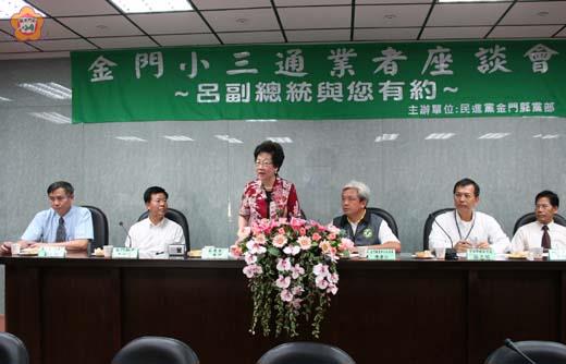 副總統呂秀蓮昨(二十二)日率團抵金展開為期二天的基層訪視、與鄉親有約座談會行程,昨上午先假金門技術學院與地區業界就小三通議題座談,下午則與地區社團代表座談,並赴金門高中與地區青年對談。她表示,金門發展不妨以柔性的思維,讓金門更加強壯、更加發展。 副總統呂秀蓮昨日上午搭乘專機抵金,隨行的包括台省教授、學者八、九十人。包括福建省政府代理主席楊誠璽、縣長李炷烽、金指部指揮官楊天嘯、民進黨金門縣黨部主委陳滄江等人到機場迎接,隨後並驅車前往金門技術學院,受到金門縣技術學院校長李金振與在場等候的小三通業者代表及師生的歡迎。 在與地區小三通業者座談時,呂秀蓮指出,她帶著耳朵與心靈,傾聽業者的聲音與意見,也會將業者的意見轉達給相關部會。 地區旅遊發展協會吳嘉獎指出,近幾年來地區部隊大量裁撤,以觀光發展為主軸,實施小三通後民眾感受不到帶來的效益,希望放寬小三通適用對象,讓全國百姓可以由金門到大陸旅遊。信用合作社理事主席陳松泉也認為中央小三通政策放開一小步,可以讓金門有發展機會。 民進黨全國黨代表翁明志(前省府秘書長)認為金門可朝向經貿特區與消費購物天堂來發展。 與會代表也提出多項建議,如:建議能放寬人民匯兌限制,可以透過金門直接匯出。有條件開放金門水域活動。加速擴建機場及設施及碼頭船舶席位;開辦貨運快遞與簡化海關通關;海巡執法應調整執法角度,不能動輒以以偏離航道處罰業者;在西洪舊機場增建機場以解決金門機場不敷使用及每逢霧季尚義機場經常關場的窘境;中央對金門小三通的政策定位要明確,才能吸引有意來金投資的廠商;興建觀光賭場;政府帶動興建五星級飯店。 會中所提關於交通與小三通政策問題,並曾由出席的陸委會副主委劉德勛、交通部航政司長林志明就權責部分做出回應。 有關地區是否設立觀光賭場的議題,縣長李炷烽認為目前中央博奕條款上尚未通過,等法令通過了,有法律依據,再由民眾決定,比較務實,否則,民眾不會認真思考設立與否。 呂秀蓮副總統表示,設立觀光賭場,有些地方成功,有些地方不成功,有的外國觀光賭場設立後,屆時黑道進來,本地人跑掉,獲利的反而是外地來的賭博集團,在地頂多增加一些服務生就業機會,甚至衍生失業率高、房地產大跌的問題,這些不好的一面都要納入考量。 對於增建西洪機場交通部的評估說明,及金門的商港是否由回歸商港法的規定的議題,縣長李炷烽也有感而發的說,做有做的理由,不做有不做的藉口,尊重交通部看法。 交通是一個地方發展的任督二脈,尤其是離島,對於航站區域擴大工程,呂副總統也要求交通部航政司加速來做。 對於地方對小三通相當熱衷,也要求政策大開放,副總統呂秀蓮指出,金門與廈門過去地理、文化上接近,看問題立場與思考和台灣不一樣,如中國大陸對我們沒有敵意與軍事威脅,打壓我國際生存空間,小三通政策也不會限縮。她對於金門曾在砲火中捍衛國家所做的犧牲奉獻表示感動,但也亦有所指的說,現在雖沒有戰爭,但一種戰爭比過去更緊密推動。 在聽取業者意見後,對於金門的發展,她認為,金門發展不妨以柔性的思維,讓金門更加強壯、更加發展。 昨下午二時許至三時,呂副總統也在金門技術學院與社團代表座談,傾聽業者的意見,隨後也前往金門高中與地區青年對談。 呂副總統今(二十三)日上午除將出席在金舉行的全國巡迴婦女組織工作座談會,也將展開大小金門參訪行程。並預訂於傍晚返台。 (相關報導見二版)