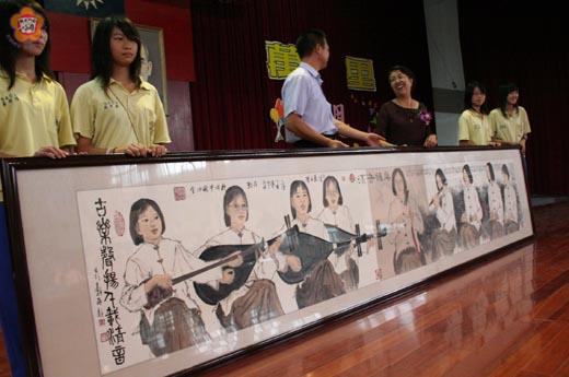 十年前,金門畫家吳鼎仁任教於金沙國中時,曾以沙中第一屆的南管社的女學生為題材,畫出創作生涯中,最大的一件水墨畫。沙中的校友陳永東(東周化學公司董事長)為了回饋母校,向吳鼎仁購買了這幅畫,昨日由校友會代贈母校。 吳鼎仁的鉅幅水墨畫長四公尺三,寬七十公分,主題為「清音雅樂、古樂聲揚、千載清音」。他的畫作價值不菲,為了回報陳永東回饋母校的美意,這幅作品是半賣半送。 陳永東還透過東周集團,聘請吳鼎仁擔任駐廠藝術家;在廠區成立畫室中,長期陳展吳鼎仁的畫作。 水墨畫中,執板主唱的人是張佳蓉,奏琵琶者為符立穎、李彥彤、陳筱萱,彈三絃者為黃雅君,吹奏曲笛者為戴美姿,敲擊響盞的人是王雅嬋,敲擊雙鐘的人是黃美華,操弄四塊的人是王倩怡。 這些人目前已經畢業多年了,吳鼎仁也已經由沙中退休了。由於當時沒有人學會二胡,所以畫中並沒有二胡。吳鼎仁希望有朝一日,沙中能把這些學生找回來,與他一起合奏一曲。目前,吳鼎仁已學會了二胡和嗩吶。