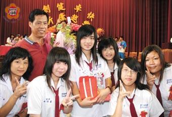 畢業了!金門農工商三甲陳婷怡(圖中)是昨日畢業典禮中的焦點人物,共上台九次,領了五項獎及八千五百元的獎學金,導師張皆欣與同學開心合影留念,彼此獻上祝福,互道珍重。 陳婷怡,綽號「大鵰」,品學兼優、允文允武,各項表現優異,不僅包辦班上前五個學期第一名,更以總平均近九十二分的優異成績代表學校參加繁星甄試,高分錄取第一志願台科大。 陳婷怡在家排行老二,姊姊陳靜怡也畢業於高職,該年通過保甄考取台灣師範大學工業工程學系,弟弟目前就讀高職電子科二年級。昨日校方盛情邀約其父母與會,因個性誠樸、低調再加上公務繁忙不克參加,成為美中不足之處,不過校方也特別將要致贈父母的花束,轉由陳婷怡代領,全體師生以掌聲表示肯定。 導師張皆欣稱讚其能動能靜並表示,三年來陳婷怡的表現可圈可點,共獲得智育、實習、德育、體育、群育、全勤等五項績優獎,以及由高職文教基金會所頒發的畢業生學習表現特優、全勤獎、競賽優良、技能精湛等四項,共領了八千五百元的獎學金,應是學校目前以來領過最多獎項的學生,成果豐碩,祝福鵬程萬里。