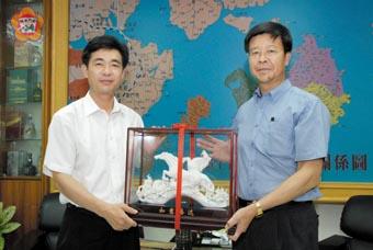 2007金門─瓷都德化陶瓷展,即將於六月八日在金門縣立體育館舉辦,中國福建省德化縣縣長李輝躍昨天也透過小三通管道前來金門,受到金門縣長李炷烽熱烈歡迎。兩位「李縣長」均希望加強兩地交流,攜手共同發展。 德化縣縣長李輝躍,昨日抵金後即前往金門縣政府拜會,受到縣長李炷烽、立委吳成典、縣府交通旅遊局長林振查熱烈歡迎。 李炷烽在致贈「經典金門」專輯予李輝躍時,並提寫了「金門永遠的朋友」表達歡迎到金門縣參訪。李炷烽並提出以金門高粱酒搭配德化陶瓷,為香港回歸大陸十週年推出紀念酒,共同行銷金門、德化特產。 金門縣日前上市被搶購一空的「巨無霸」三十公升醰裝金門高粱酒,即是德化陶瓷和金門美酒的組合,李炷烽也希望兩縣再度合作,以「金酒德陶」模式生產香港回歸十週年紀念酒,共創商機。 李輝躍則對金門空氣清新、衛生好、環境好,留有深刻印象。對於這趟金門行的瓷都德化陶瓷展順利舉辦,並表示是大家共同努力所致。希望未來兩縣更加相互學習和藉交流往來,以促進溝通、了解。 據金門縣商業會表示,金門和德化名瓷展,六月八日上午揭幕後,一連展售三天,除了有金門官營民營陶瓷廠參加外,來自德化有四十三家廠商跨海參展,展出產品包括藝術陶瓷、塑雕陶瓷、日用陶瓷等一萬多件。