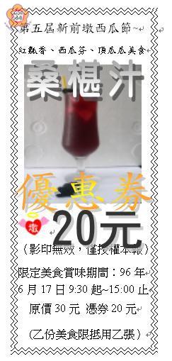 第五屆新前墩西瓜節訂於六月十七日舉行;自六月一日起,新前墩社區開始推出各式「折價券」或「優惠券」。今天發行的是「桑椹汁」優惠券。 讀者可將新聞版面上所印行的「桑椹汁」二十元優惠券剪下。憑這張優惠券,可在六月十七日的西瓜節活動中,以二十元的現金購買一杯桑椹汁;桑椹汁的原價是三十元。必須注意的是,讀者只能剪取報紙上所印刷的優惠券,影印或用其它方式複製都無效。 新前墩桑椹汁的作法是將鮮採的桑椹洗淨,以免有蟲子、蛛網附著。將等比例的桑椹與冰糖放到鍋中以小火加熱;約一點五到兩小時,就可熬成濃汁。 將桑椹濃汁調水,並加入冰塊,即可冷飲。若要當成熱茶飲用,冰糖的比例要增加,並且要熬四個小時,使成黏稠狀。 六月十七日,在西瓜節中賣的是調製好的冰涼冷飲;每杯的售價是三十元,憑優惠券,只要二十元,可以折抵十元。 由金門日報和新前墩西瓜節所發行的折價券或優惠券,一張只能用於一份西瓜節美食。例如一張桑椹汁優惠券加上二十元現金,只能購買一杯;不能用兩張優惠券換取一杯桑椹汁。 六月一日,本報已發行了「南瓜蔥油餅」的折價券。一份南瓜蔥油餅的售價是二十元;憑折價券,用十元現金就可買到。未來,本報還將配合新前墩西瓜節活動,推出西瓜爽、番茄麵疙瘩粥等西瓜節美食優惠券。