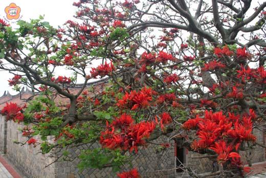 每年五月母親節過後,就是金門民俗村的刺桐花季;今年的花季已於上周開始。此際,在民俗村外,遠遠望去,可以看到:刺桐花開一樹紅,中有八哥起落頻。入民俗村內,盤桓樹下,可以看到:瓣如彎月紛紛落,朱光滿地覆綠茵! 刺桐是山后民俗村中最為光豔溢目的園林植物,內外原本有五株。在民俗村內,七十四號的右側門外有一株,在六十九號「大夫第」的左側門外也有一株;在民俗村外,候車亭後有一株,在山后七十七號前也有一株;另外還有一株,據林務所的文獻記載,因為遭颱風吹折,已經被移植到他處(金門國家公園)。另據居民王世英所述,五株刺桐有母子關係;母株就在七十四號門外,其餘都是子株。 目前,花開得最燦爛的,就是編號C-008的刺桐,栽植時間約為光緒十二年(西元一八八六年)。 C-008就位在七十四號古厝旁(側門外),隔著防空洞與L形的桄榔樹相看。登上防空洞,可以近觀刺桐花千層吐豔的美景;若將民俗村的紅瓦古厝與刺桐的丹葩齊觀,更有景物交融之妙。樹上有一群八哥在花叢中尋找獵物;不過,當人們太靠近時,就會振翅而去。 刺桐花的花瓣呈長橢圓狀,但卻是自然對摺,形如彎月。一樹的刺桐花,綻開時是望之不盡;墜落時也數之不盡。紅紅的花瓣,散在防空洞上,在草皮上,在紅磚上,在石板上,讓周圍的景物,都沾惹了它的紅豔。 在刺桐樹下清掃落花,似乎是一件雅事,若能留著殘花映媚,不也是一種美感?不過,掃花的人卻說:馬上又會有落紅滿地,不愁沒得看。可不是?清空了地上的殘紅,盯著新的彎瓣落在綠茵上,景象仍讓人欣喜。 從七十五號古厝所在的方向看刺桐,主幹分成四根分枝主幹向兩側斜斜高舉,另有一根較細的分枝由主幹分出後,向上、向後、向下延伸,好像把手伸到背後搔癢一般。從反方向看刺桐,主幹的表面裂成了盆狀開口,口中吐出大舌頭狀。盆緣成了野草野花的天然花盆。地上的根系,露出地表的部分,呈現溝狀,也成了野草野花的天然花盆。 刺桐常有易腐的中空主幹,這是這種樹的特性。在大夫第旁的刺桐,主幹原本有一個中空的孔,但後來隨著樹身長大,開口已經閉合,樹下的石桌石凳,則被地表的盤根掀得東倒西歪。在候車亭後面的刺桐,主幹雖然中空卻沒有洞穿,竟成了資源回收桶,堆了許多瓶瓶罐罐。 民俗村的刺桐雖美,卻不是沒有隱憂。民國九十三年,台灣全省的刺桐行道樹,已出現前所未聞的害蟲,經國外學者鑑定,確認為是一種新種的「刺桐釉小蜂」。這種昆蟲體型微小,肉眼觀察不易,只侵襲刺桐屬的樹木。受害的刺桐會逐漸落葉,樹勢逐漸衰弱甚至死亡。至今還沒有效的防治措施;而民俗村的刺桐,已確定受到感染。 今年以來,各地都有新的疫情傳出,例如嘉義縣的縣治特區和東石漁人碼頭,總計約有一百株刺桐受到感染,受害至少五年。彰化縣、彰化市的受害植株連綿兩公里,包括埔鹽鄉石石碑村一株號稱百年的刺桐。台中市多處刺桐類的行道樹也已遭到蟲蟲危機,今年二月發現時,已感染三個月。 金門地區是在民國九十四年八月發現有刺桐釉小蜂的蹤跡,後來又進一步發現民俗村的刺桐也遭波及;所幸,去年和今年五月的花季,都還看得到紅豔滿枝,可能蟲害的情況還沒有很嚴重。由於世上還沒有確實有用的根治方法,相關單位只能持續保持觀望。