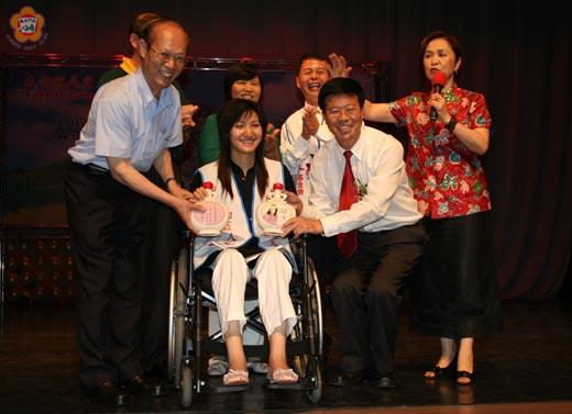 國立中山大學政治經濟學系三年級學生楊媛甯(如圖),和弟弟同樣罹患「脊髓性肌肉萎縮症」,終生與輪椅為伍,從無法接受自己,到勇敢走出社會,楊媛甯說,正面看待人生,讓她在生命中看到希望。 楊媛寧很高興獲獎,她表示,獲得熱愛生命獎章,帶給她更大的勇氣,讓她努力過好當下的生活。 被封為「抗萎天使」的楊媛甯,從小罹患「脊髓性肌肉萎縮症」,需終生與輪椅為伍,目前仍無藥可醫,只有透過復健減緩它的惡化速度。 但是在父母楊登發、王德美無微不至照顧,以及以平常心看待,鼓勵她「沒有試過就不要說自己做不到」,讓楊媛甯能夠建立正確正面的人生態度,不怨天、不尤人,勇敢接納病痛,不害怕開口請求別人幫忙,品學兼優,自助助人,活在當下,創造未來。 雖然坐著輪椅,楊媛甯也能打桌球、羽毛球、籃球,開展出生命的無限可能。而父母、老師、同學一路相挺、關愛,讓她更有勇氣完成大學的獨立生活,並有餘力去輔導身心障礙的學弟學妹。因此,她始終秉持母親王德美的「愛的諾言 活在當下」,無懼於肌肉萎縮症的糾纏,並且時時勉勵自己,「生活的豐富與否,決定權在於自己願意不願意踏出這一步」。