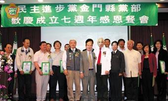 五月一日為民進黨金門縣黨部成立七週年,金門縣黨部昨日提前舉辦了感恩餐會的慶祝活動,考試院長姚嘉文、福建省政府主席顏忠誠、金門縣議會議長謝宜璋到場與縣黨部現任、歷任主委與黨員同志共同慶生,見證民進黨在金門的成長與進步。 感恩餐會於昨日中午在盈春閣餐廳舉行,由縣黨部主委陳滄江主持,前民進黨主席現任考試院院長姚嘉文、福建省政府主席顏忠誠、金門縣議會議長謝宜璋、縣府機要秘書周浯斌、金門紅十字會會長王水彰、民進黨前立委及全國不分區立委候選人沈富雄等人等人應邀到場參加,與縣黨部前主委翁明志、陳作生及黨內幹部同志同聚一堂,提前為縣黨部成立七週年慶生,場面熱絡。 餐會中並由民進黨前主席姚嘉文頒發感謝狀給紀徐見、翁文雅、傅子貞、楊財祥、歐陽有格、莊根添、唐麗輝、林金羨、陳信雄、楊成家、歐陽彥森、吳增允、蔡建鑫、洪長成、蔡建福等人,感謝他們幾年來對於黨務工作推展的付出及縣黨部所舉辦活動的支持與協助。 在縣黨部七週年生日餐會中,主委陳滄江指出,西元二○○○年五月,七位民進黨員創立了民進黨金門縣黨部,七年來二千五百多個風雨的日子,感謝黨員同志在黨最艱難的時刻、無怨無悔支持付出,不離不棄,讓黨部成長與進步。 他說,雖然目前縣黨部黨員有一千多人,仍有進步的空間,希望在大家的努力下更成長。 民進黨前主席姚嘉文也談到幾年前任職黨主席時曾來金,當時只有七、八位黨員,事隔幾年後,看到黨員已增加到一千多人,他說,這是大家共同努力的成果,也希望未來持續加強黨員訓練工作,並與地方人士配合,使黨部更加成長茁壯。 福建省政府主席顏忠誠指出,民進黨縣黨部七週年慶活動辦得很熱鬧、出席的黨員相當踴躍,祝黨部生日快樂! 他也表示,民進黨在金門民眾接受度低,金門縣黨部七年走來,可說備極辛苦,但有今日的發展成果也令人興奮,民進黨在金門可是第二大黨(僅次於國民黨),辦理各項活動也相當積極,做得非常好,見報率高,相信未來持續衝刺、經營,前景是一片光明! 受邀出席的縣議會議長謝宜璋也表達內心的高興,他說,民進黨在金門經營能有今日的小有局面,絕不是三冬(年)二冬(年)就可達成的,民進黨金門縣黨部在省府(中央)為執政黨、在縣府為在野黨。民進黨金門縣黨部心事誰人知?謝宜璋也當場消遣了沈富雄說,只有沈富雄最清楚。 專程來金參與縣黨部生日餐會,並為自己拉票的民進黨全國不分區立委候選人的沈富雄在接續上台致詞時也不忘為自己選情告急爭取金門黨員的支持,他風趣地回應了謝宜璋說,議長的相挺,如果在台灣是相害。 他說,他不去台灣較大的黨部去拉票,只來金門拉票,因為大部分的黨員票都被綁光,自主票不到一成,來到金門讓他心裡感到很溫暖。 他表示,民進黨分為二群,一群是專門修理人、一群專門被修理的,他也是不被諒解的。他說,若是衝衝衝像王世堅、作秀像蔡啟芳,對黨員像阿公疼孫一樣,這些,他都做不到。 民進黨主軸是相信台灣,但他相信金門!沈富雄說,此次選舉他民調原本遙遙領先,但黨更改遊戲規則,支持他的黨員票少得可憐,是安全名單外,下(五)月六日民進黨不分區立委黨內初選開出的票,金門支持他的如沒跑票,那很好!但票沒開出,他也不埋怨:::。 民進黨金門縣黨部首任主委翁明志也形容七年來民進黨從無到有,由牙牙學語、學走路、上幼稚園、到上國小,一年一年長大,相當不簡單,值得慶祝。並指出,縣黨部成立不易,幾年來在黨員幹部熱誠服務打拚才有今日的成就,希望未來大家持續來疼惜栽培。