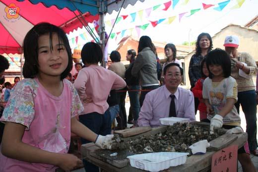 「蚵村」古寧頭的雙胞胎小朋友宋大雙、宋小雙,雖然年紀僅六歲,但是剖起蚵來,卻是有模有樣,相當的熟練,成為昨日剖蚵比賽會場中受注目的焦點人物。宋大雙、宋小雙是陪著媽媽蔣鳳凰一同參加剖蚵比賽。蔣鳳凰說,她從台灣嫁來古寧頭已有十一年,從不會剖蚵慢慢學起,宋大雙、宋小雙兩個小孩在兩歲大時就開始剖蚵了,只要有時間,姐妹們都會幫忙阿嬤剖蚵。 鄉長李文俊特別在場為這對姐妹加油、打氣,他說,活動的主要用意就是要大家感受到石蚵「粒粒皆辛苦」。
