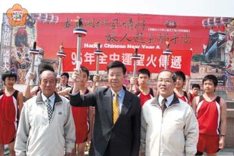 96年全國中等學校運動會,即將於四月二十一日至二十六日假台南縣舉行,離島線聖火傳遞小組昨日下午以「空運」方式將聖火傳抵金門,縣長李炷烽親自帶領金門縣聖火隊迎接全中運聖火的到來,同時,薪傳寧中小學生組成的聖火隊展開全島聖火傳遞。李縣長也表示,聖火象徵著光明、勝利和希望,期待全中運順利、圓滿,金門代表隊有好的成績表現,為金門爭光。 全中運聖火傳遞已於四月二日展開,在繞行全國各縣市後,也展開離島的聖火傳遞,由聖火組副組長林宗平帶領工作人員護送「聖火」傳抵金門,昨日下午二時三十分許的迎接聖火儀式中,縣長李炷烽率領縣府教育局長李再杭、課長許能麗、縣立體育場主任許煥生、以及寧中小校長許維民和學生組成的聖火隊到民航站前廣場迎接聖火,金城國中也派管樂隊奏樂迎接,場面十分隆重,吸引台金旅客的目光,同時也分享全中運即將登場這項喜訊。 林宗平代表將全中運聖火傳遞給縣長李炷烽,李縣長隨即引燃給寧中小校長許維民所帶領的聖火隊,展開全島各鄉鎮傳遞行程。 在警車的開道下,聖火隊車隊先傳遞金湖鎮市街後依序金沙鎮沙美市街、金寧鄉頂堡經慈湖至金門高中,再沿金城鎮市街到縣立體育館。聖火預訂於今(十二)日下午四時卅分回返台灣本島。 此次金門所組之代表隊計有四十五人,將由縣府教育局長李再杭出任總領隊,預計參加田徑與跆拳兩個項目,參加的隊職員有:副總領隊:楊瑞松、陳水芳、李世峰;總幹事:許能麗;幹事:莊明順;金門高中田徑教練:林偉倫、楊振榮;選手:薛辰緯、謝佳鈞、魏潤琪;金門農工田徑管理:林學金;金門農工田徑教練:辛雷達、黃嘉維;選手:吳紹穎、林志軒、蔡啟民、楊易霖、楊績輝、許仲宇、張明惠、曾怡靜。金城國中田徑教練:倪國煥、陳振秀;選手:李念倫、楊濬倫、王鈺涵、陳穎瑩、盧靜賢、蔡欣雅。金湖國中田徑領隊:吳啟騰;田徑教練:楊恭文、翁炳根;田徑選手:李 濬、陳書賢、劉致儀、吳祺森、王書璿、陳子豪、陳至瑩。金寧國中跆拳教練:周清曜;田徑選手:翁肇隆;跆拳選手:蔡世毅。烈嶼國中田徑教練:莊舒惠;田徑選手:林孟儒。