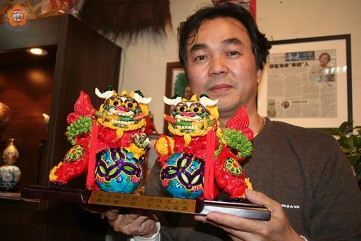 金門風獅爺正火紅!拜上月樂透彩新聞效應,金門的「招財吉祥對獅」意外成為最近當紅的炸子雞,台灣許多商店與民眾都指名要這款商品,讓商品供不應求,幾乎是賣到缺貨,業者說,單單最近的訂單就高達有二百多件,成為近來的發燒商品。 上個月底台南縣有一台灣彩券投注站,開出高達七億的頭獎,由於獎金相當高,讓該站備受媒體關注,店家在受訪時,也大方秀出鎮店之寶─金門的「招財吉祥對獅」,讓金門的對獅,一度躍上媒體頭版,成為當地茶餘飯後討論的焦點,而這股效應,還延燒發酵,很多人都特別慕名到金門來搶購。 據浯洲陶藝創意總監王明宗表示,單單最近的銷售量就很驚人,新聞一曝光後,就賣了將近二百件,且坊間甚至還出現許多仿冒品,讓他們也覺得相當詫異。 王明宗說,其實這款商品,並不是最近的作品,早在二○○一年就在大陸問世開賣,到今年為止,總計已賣出五、六萬對,由於造型獨特又有招財意涵,一直都是該公司的熱賣商品,最近更是賣到嚇嚇叫,成為詢問度最高的商品。 王明宗回憶,當初在構思設計時,主要是想給風獅爺不同的變化,因為金門的風獅爺大部分都是站立的,所以他想把風獅爺變化的柔和些,於是設計出踩著彩球造型的可愛風獅爺,另外,考量到商家的招財期待,還有姊妹品是踩著聚寶盆,由於對獅是屬於交趾彩釉創作,所以造型、神態都大不相同。 「家中有對獅、賺錢沒人知;家中有一對、年年大富貴」對獅採用喜氣的紅、黃色調;嘴中還有一把七星劍;造型與姿態都相當獨特,王明宗逐一細數對獅的特色,直說是參考古書得到的靈感,他說,風獅爺不能一成不變,否則會沒人要買,他希望把藝術生活化,將風獅爺幻化成各式商品,將這個屬於金門特色的吉祥物,行銷到全球。 有風伯傳人之稱的王明宗,為了幫風獅爺尋根,近年來走遍大陸各地,他說,只有追溯出風獅爺的來龍去脈,才能更佳掌握到創作精髓;王明宗提到,早期金門沒有雕刻師傅,都是大陸的老師傅過來雕琢,他曾經尋到同安一帶,發現當地也有類似的風獅爺,經詢問當地耆老後得知,他們的風獅爺已經有相當久的歷史,只是功能不是鎮風,而是鎮路沖,最近他又聽聞惠安一帶也有,正打算找時間前往探尋。 多年來王明宗持續不斷的創作風獅爺作品,不但有台灣多家電視台慕名前來採訪,甚至大陸漳州工藝博物館還特別典藏他的「招財」、「加冠」兩座風獅爺,此外,還因為他曾經上過衛視電視台節目,在大陸的知名度持續攀升,許多大陸的民眾看到他,總會說兩岸一家親,看到他的作品就感到相當親近,讓他很欣喜。 但是王明宗也忍不住大吐苦水,原來是對獅商品在大陸上架後,因為銷售成績不俗,專利權後來卻被經銷商(也是其大陸好友)給搶登記走了,由於對方政軍關係良好,又出動當地黑道,一度反客為主,要求他不能在大陸販售相關產品,讓他相當氣憤,後來,經過就教法律專家,才得知大陸法令是只要商品先在媒體曝光,就不可以貿然搶登記,才讓他稍微放心。 學藝術的王明宗坦言與大陸官方打交道並不在行,他只想堅持藝術理念繼續創作下去,在遇到先前的專利權風波,的確讓他嚇了一跳,一度還怨嘆天理何在,還好天公疼好人,如今前進大陸市場,他會更當心,也期待作品可以得到更多人的認同。