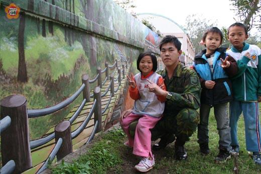 塗飾不圖報,質美就值得! 金東旅各營中派了六名有繪畫本領的士兵,協助安瀾國小彩繪校園。其中蘇郁仁(見圖)是出力最多,參與最久的人之一;其他人有些已經退伍了。 他從十二月畫到昨天(三月二十日),把學校需要的交通、節令、健康、名勝畫上防空洞及車棚的牆壁。在繪事過程,他們是冒著寒風,甚至還抱病上陣,有時一畫就四到六個小時。回到營隊,還是有份內的事等著他們:::。 對於這次的協助,安瀾國小張秋沐至為感謝;金東旅政戰主任林文銘則代表旅長郭瑞祥及各營表達義不容辭及樂於相助的態度。 圖中這幅畫五虎山木棧道是蘇郁仁最得心應手的一幅。他說,在金門當一年四個月的兵,能在退伍之前,為地方上做一點自己喜歡做的事,為學校的師生們留下一點東西,非常值得! 蘇郁仁也參與后嶼虎軍壁畫的繪製,那堵畫有一層樓高;不過,若論單幅的實際面積,還是在安瀾國小畫的壁畫比較大。
