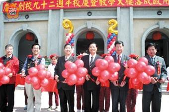 金門縣小學最具歷史和規模的金城鎮中正國民小學,昨天舉行創校九十二週年校慶暨新建教學大樓落成啟用典禮,會中由省主席顏忠誠、縣長李炷烽頒獎表揚傑出校友及資深員工。顏忠誠期勉同學們要努力讀書,好好學習,不斷充實自己。縣長以「獨善其身、兼善天下」最基本要求與素養勉勵同學們,希望能成為社會的標竿,營造一個培養身心向上、活潑,充滿朝氣的金門。 中正國小創校九十二週年校慶暨新建教學大樓落成啟用典禮於昨日上午九時在校園中庭舉行,慶典由中正國小祥獅獻瑞演出揭開序幕,校長張峰德主持,包括福建省政府主席顏忠誠、金門縣長李炷烽、立法委員吳成典、金指部參謀長羅銘昇少將、縣議員李沃士、縣府教育局長李再杭、文化局長李錫隆、金門技術學院校長李金振及地方各界首長、學校校長與校友等熱烈參加,向一千七百多位師生祝賀校慶,整個校園洋溢著熱熱鬧鬧、喜氣洋洋的氣氛。 中正國小的前身為創立於1915年金門縣立第一高等小學,與金門建縣同時,經過浯江小學、金門公立第一小學、珠浦鎮中心國民學校、城廂中心國民學校、金門示範中心國民學校、金城鎮中心國民學校、金城鎮國民小學等數度易名,1978年為感念先總統蔣中正對金門的關愛,更名為中正國民小學迄今,為全縣規模最大的小學。 慶祝大會上,由福建省政府主席顏忠誠頒獎表揚傑出校友許國智、李水泉、石曉楓、薛德清、林成文、傅仰添,何莉莉、陳經武、蔡輝詩、王明宗等十人,縣長李炷烽頒獎表揚在校服務年資連續二十年教師郭永壽、楊蓮花等兩人,以及頒發感謝狀給金門技術學院校長李金振、金門縣公共車船管理處處長王漢文、金門縣林務所所長葉媚媚。 中正國小前身畢業的老校友省府主席顏忠誠受邀致詞時指出,這棟新建大樓美輪美奐符合現代教學的大樓,回想當年在校求學情形,他說,李縣長大手筆花了一億二千多萬元興建這棟大樓,可見教育出身的縣長對教育的重視,教育是國家未來興旺的希望,地方要繁榮發展,國家要強盛,人才是最重要的關鍵,人才從哪裡來,所以學校的設備和師資與過去是不可同日而語。顏忠誠期勉同學們要努力讀書,好好學習,不斷充實自己,未來是社會國家的棟樑。他說命運是掌握在自己的手中,要靠自己來創造,只要不斷的學習,不斷充實自己,以後對社會就能做出偉大的貢獻。 縣長李炷烽也表示來中正是我懷念最深的時代,記得民國七十四年接到命令,派任到中正國小和所有前輩、老師共同學習,這是我經濟生活上懷念最多的地方,看到今天中正國小一片欣欣向榮,我懷著感恩心情向所有獻身這所學校同仁表達感恩與肯定。記得剛來報到時中正一切建築都是要從頭開始,感謝當年縣府與金防部的支持才完成各項建設,如今校園建築的美輪美奐,回到這裡想到過去種種感覺又年輕起來。學校所創設的金苗獎、博愛社都能延續至今,這是大家過去的努力才有今天。對這棟大樓建築的工程品質,李縣長也稱讚有加,可做為建築承商的觀摩學習的榜樣。李炷烽也為「至善樓」題字,並以、「獨善其身、兼善天下」做為每個同學最基本要求與素養。希望能成為社會的標竿,營造一個培養身心向上、活潑,充滿朝氣的金門。 立法委員吳成典也以「烏龜與兔子賽跑的故事」,勉勵小朋友要學習效法烏龜腳踏實地、奮鬥到底的精神。 省主席顏忠誠、縣長李炷烽、立法委員吳成典、縣議員李沃士、金城鎮長蔡輝詩等人為中正國小新建教學大樓「至善樓」剪綵,這棟地下一層、地上五層的教學大樓,工程造價一億二千零五十萬元,是由教育部補助四千萬元,其餘由金門縣政府自籌興建,包括教室、圖書館、會議室、校史館、行政室及游泳池等,為近幾年金門最大手筆的教育投資。 中正國小並在學校運動場推出班際親師生趣味競賽,推出項目一年級是捍衛地球,二年級是一步一腳印,三年級是粒粒皆寶貝,四年級是百發百中,五年級在一樓教室走廊舉辦「千鶴齊飛、感恩惜福」,六年級則在新建至善樓後方榕樹下推出「中正禮讚、飲水思源」,以及書畫展等活動,全校師生以歡欣鼓舞的心情慶祝九十二歲生日,校園內洋溢歡樂氣氛。